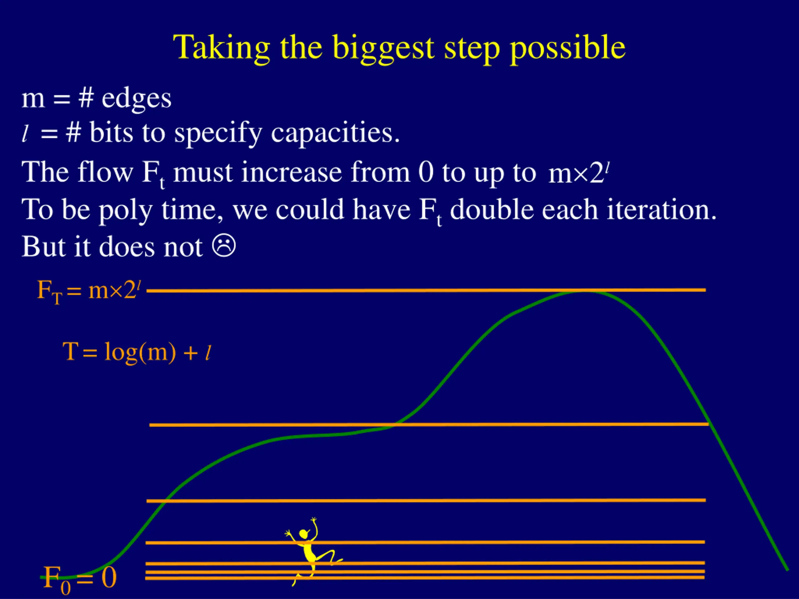 Taking the biggest step possible m = # edges l = # bits to specify capacities. The flow Ft must increase from 0 to up to To be poly time, we could have Ft double each iteration. But it does not FT = m 2l m 2l T= log(m) + l F0 = 0