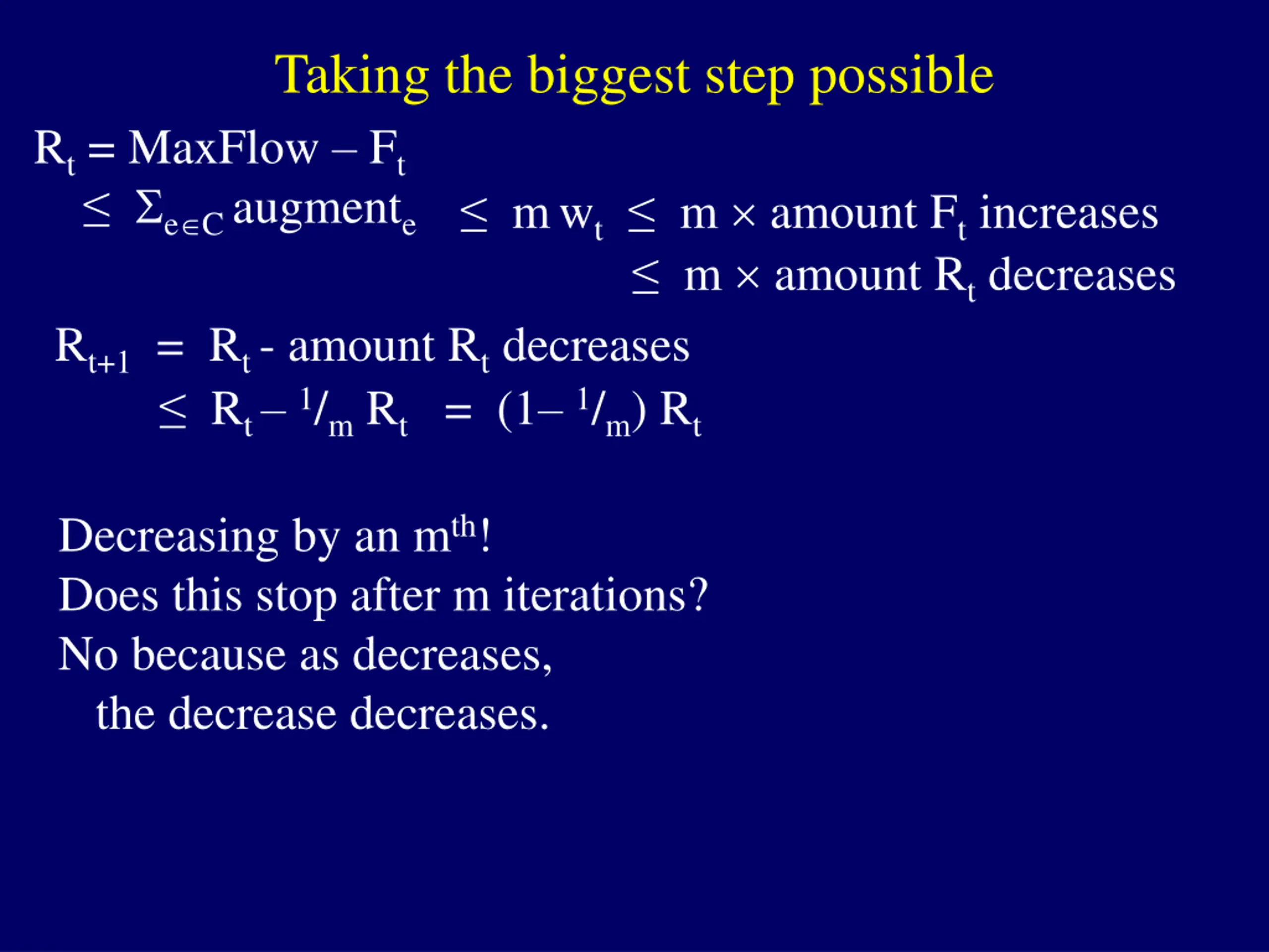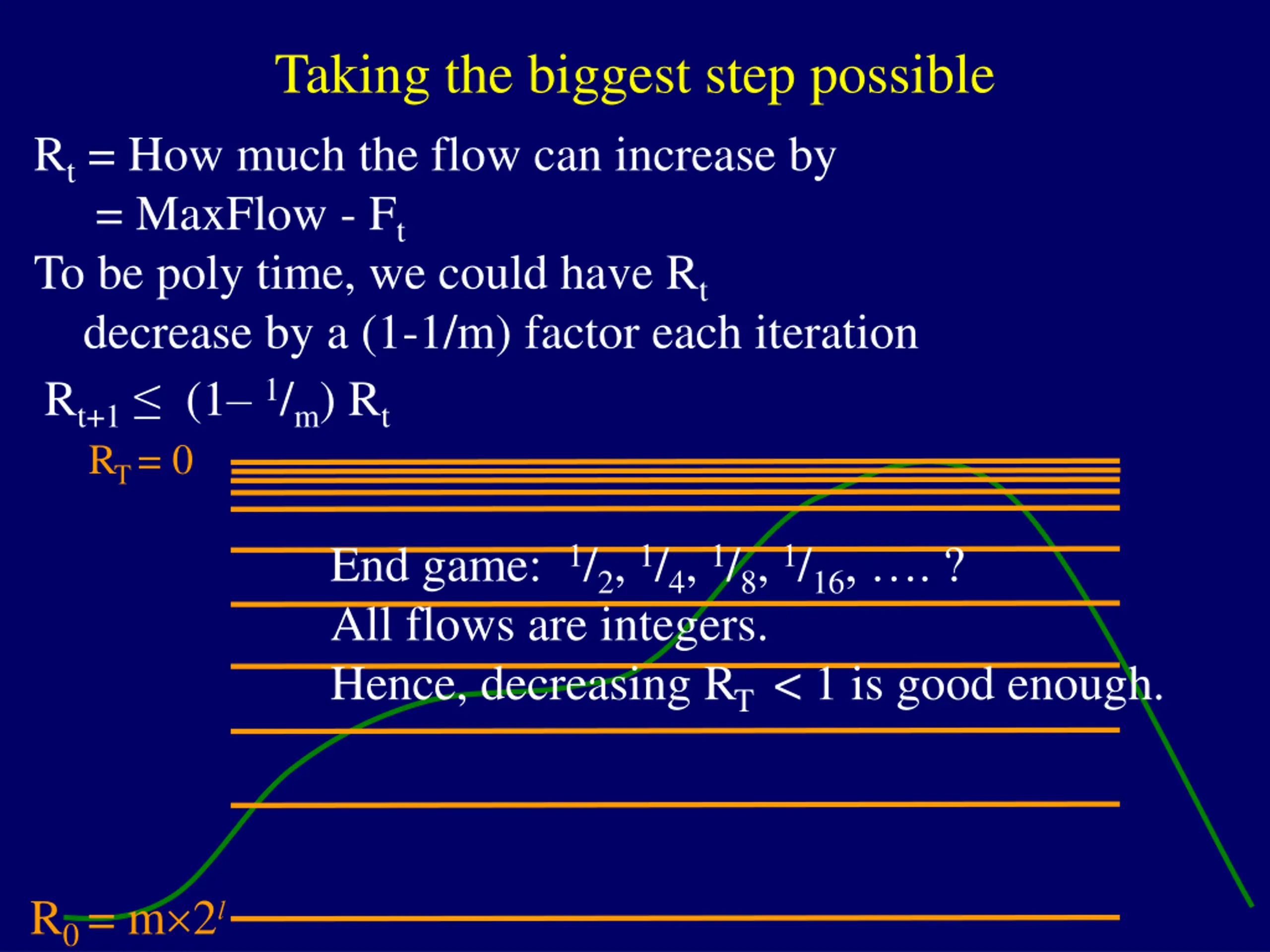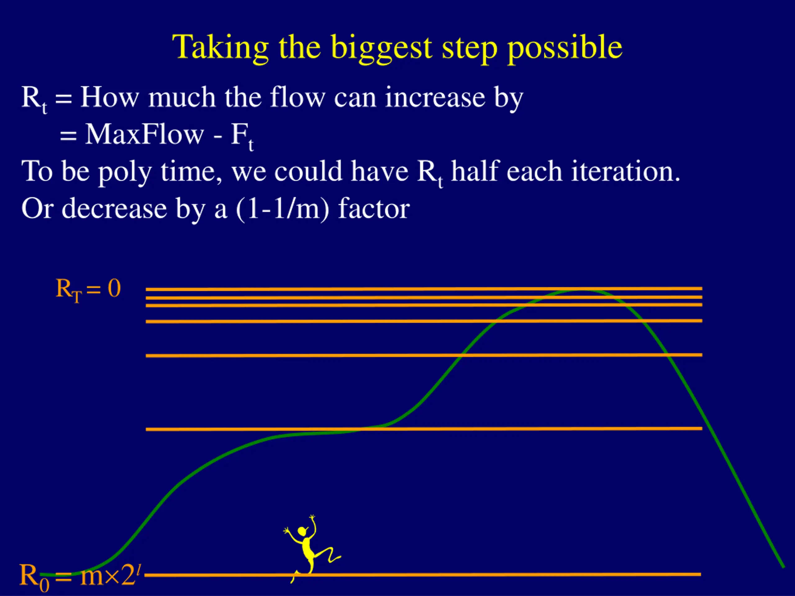 Taking the biggest step possible Rt = How much the flow can increase by = MaxFlow - Ft To be poly time, we could have Rt half each iteration. Or decrease by a (1-1/m) factor RT = 0 R0 = m 2l