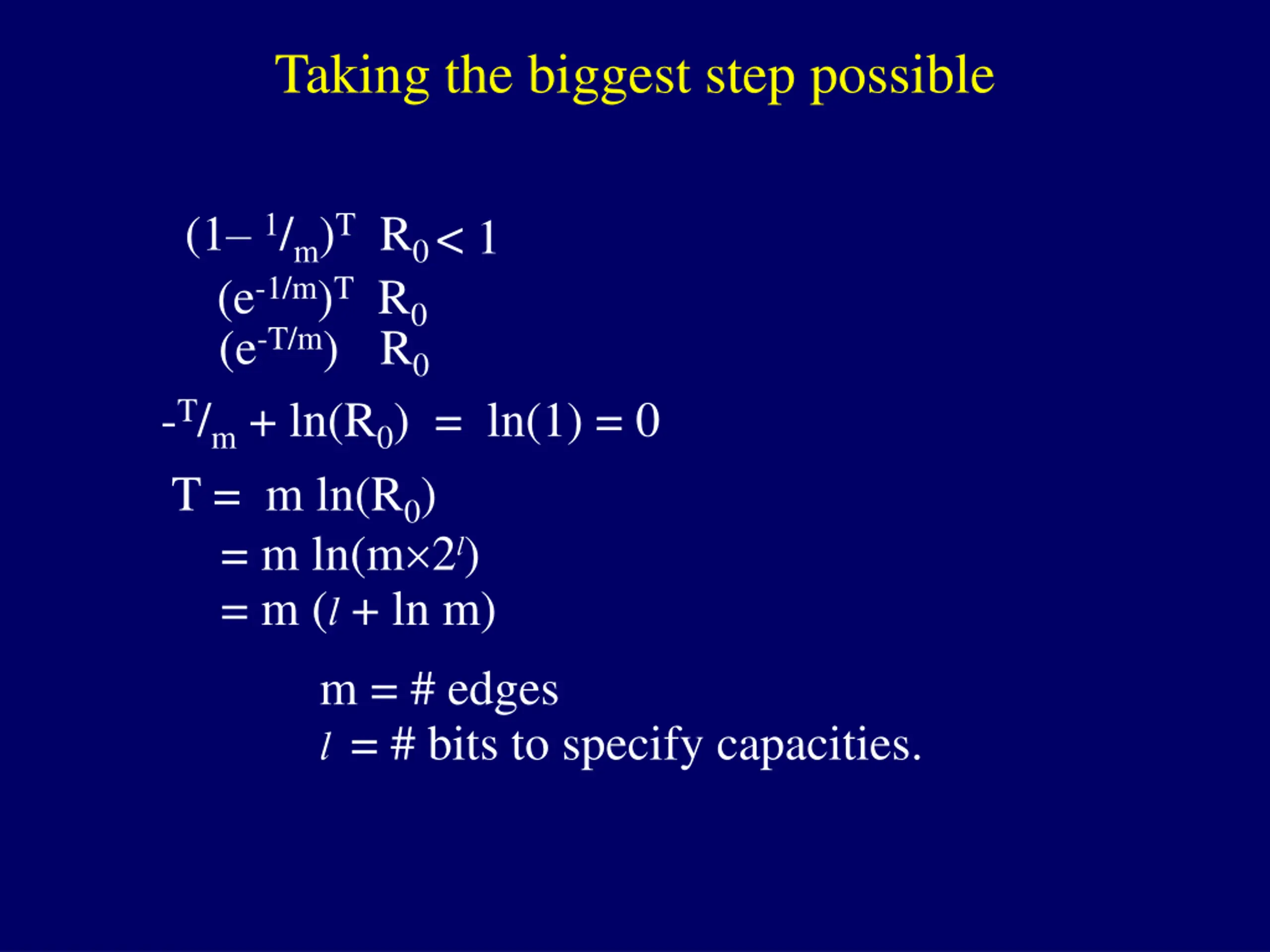 Taking the biggest step possible (1 1/m)T R0 (e-1/m)T R0 (e-T/m)R0 -T/m + ln(R0) = ln(1) = 0 T = m ln(R0) = m ln(m 2l) = m (l + ln m) m = # edges l = # bits to specify capacities. < 1