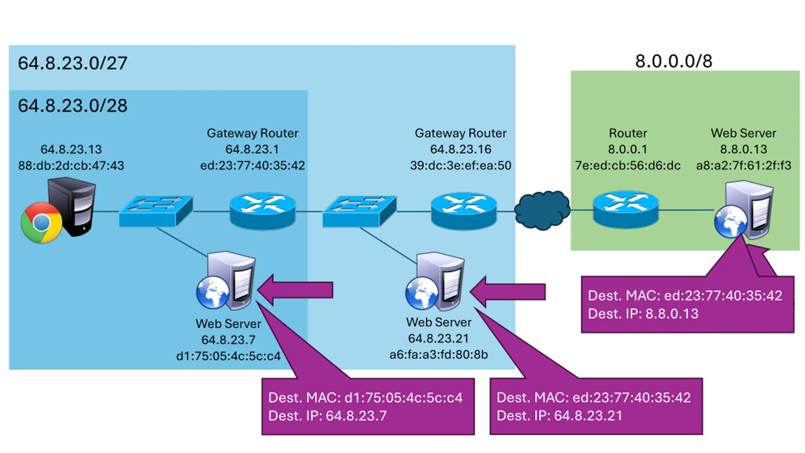 8.0.0.0/8 64.8.23.0/27 64.8.23.0/28 Gateway Router 64.8.23.1 ed:23:77:40:35:42 Gateway Router 64.8.23.16 39:dc:3e:ef:ea:50 Router 8.0.0.1 Web Server 8.8.0.13 a8:a2:7f:61:2f:f3 64.8.23.13 88:db:2d:cb:47:43 7e:ed:cb:56:d6:dc Dest. MAC: ed:23:77:40:35:42 Dest. IP: 8.8.0.13 Web Server 64.8.23.21 a6:fa:a3:fd:80:8b Web Server 64.8.23.7 d1:75:05:4c:5c:c4 Dest. MAC: ed:23:77:40:35:42 Dest. IP: 64.8.23.21 Dest. MAC: d1:75:05:4c:5c:c4 Dest. IP: 64.8.23.7