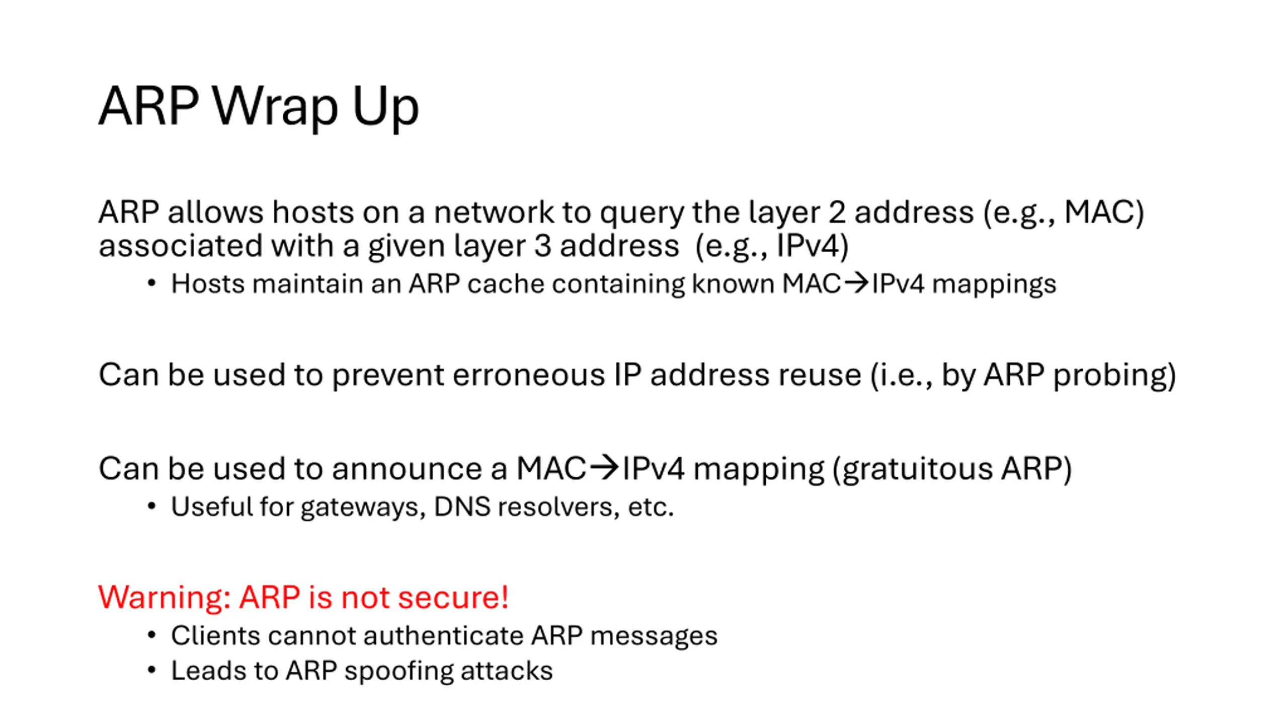 ARP Wrap Up ARP allows hosts on a network to query the layer 2 address (e.g., MAC) associated with a given layer 3 address (e.g., IPv4) Hosts maintain an ARP cache containing known MAC IPv4 mappings Can be used to prevent erroneous IP address reuse (i.e., by ARP probing) Can be used to announce a MAC IPv4 mapping (gratuitous ARP) Useful for gateways, DNS resolvers, etc. Warning: ARP is not secure! Clients cannot authenticate ARP messages Leads to ARP spoofing attacks