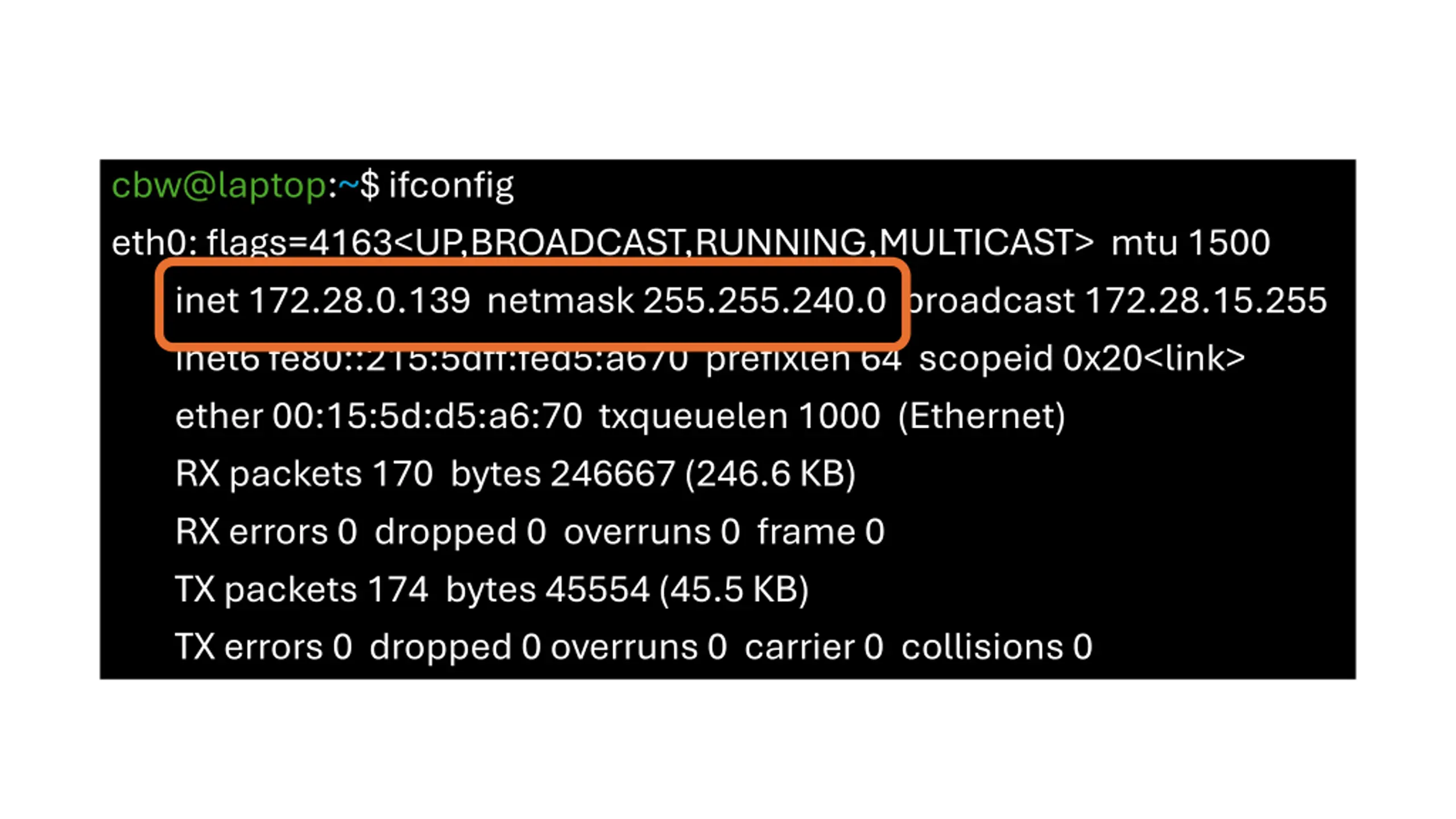 cbw@laptop:~$ ifconfig eth0: flags=4163<UP,BROADCAST,RUNNING,MULTICAST> mtu 1500 inet 172.28.0.139 netmask 255.255.240.0 broadcast 172.28.15.255 inet6 fe80::215:5dff:fed5:a670 prefixlen 64 scopeid 0x20<link> ether 00:15:5d:d5:a6:70 txqueuelen 1000 (Ethernet) RX packets 170 bytes 246667 (246.6 KB) RX errors 0 dropped 0 overruns 0 frame 0 TX packets 174 bytes 45554 (45.5 KB) TX errors 0 dropped 0 overruns 0 carrier 0 collisions 0