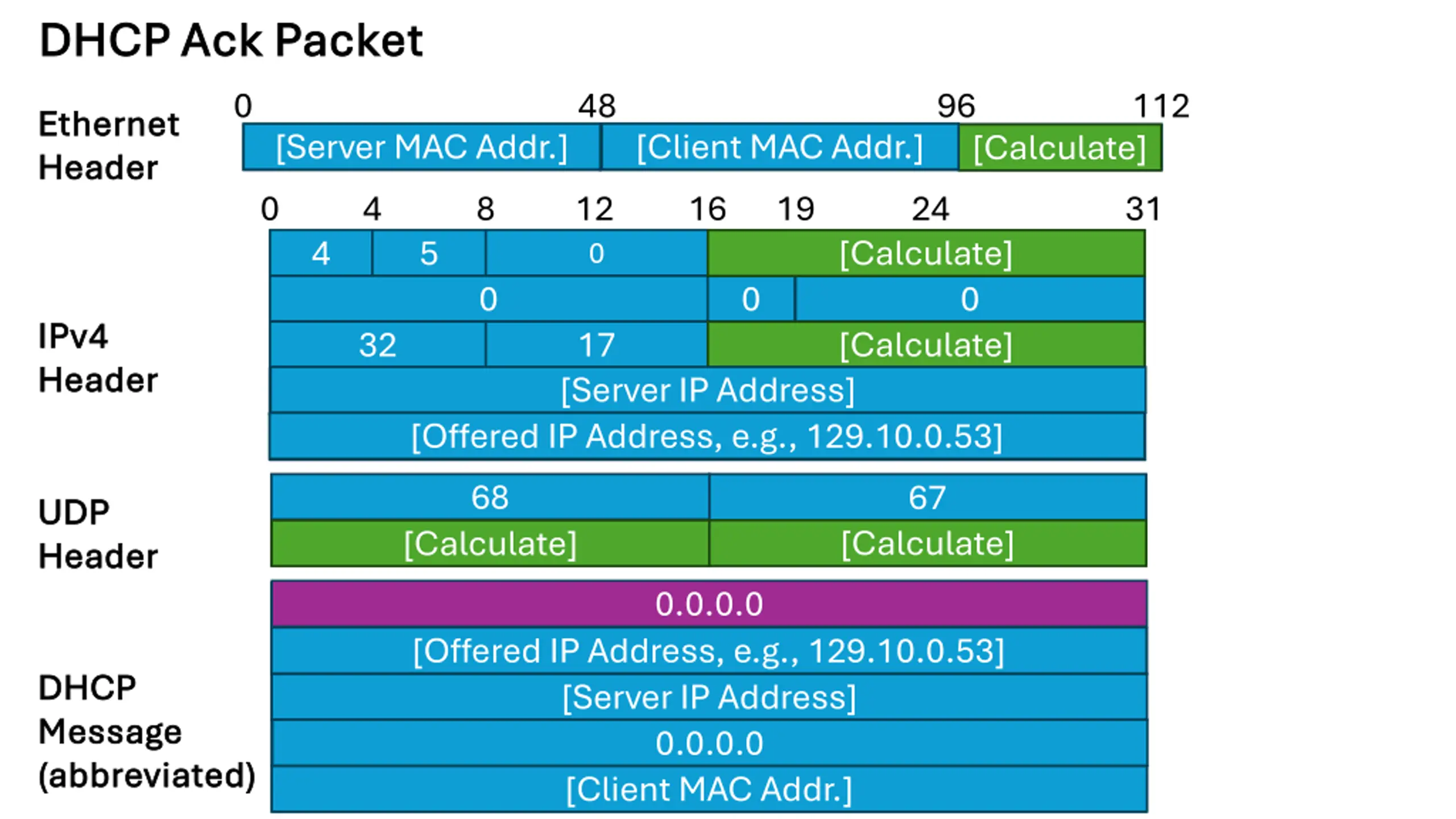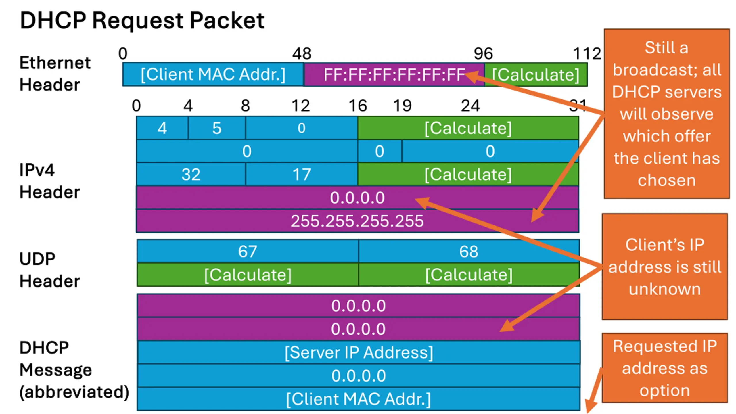 DHCP Request Packet DHCP Request Packet Still a 0 48 96 112 Ethernet Ethernet Header Header broadcast; all DHCP servers will observe which offer the client has chosen Source MAC Address [Client MAC Addr.] Dest. MAC Address FF:FF:FF:FF:FF:FF Frame Len. [Calculate] 0 4 8 12 16 19 24 31 Version HLen 4 5 [Calculate] Datagram Length Offset Checksum [Calculate] DSCP/ECN 0 Identifier 0 Flags 0 0 IPv4 IPv4 Header Header TTL 32 17 Protocol Source IP Address Destination IP Address 255.255.255.255 0.0.0.0 Client s IP address is still unknown Source Port 67 68 Dest Port Checksum [Calculate] UDP UDP Header Header Datagram Length [Calculate] 0.0.0.0 0.0.0.0 Client IP Address Your IP Address Server IP Address Gateway IP Address Client Hardware Address [Client MAC Addr.] Requested IP address as option DHCP DHCP Message Message (abbreviated) (abbreviated) [Server IP Address] 0.0.0.0