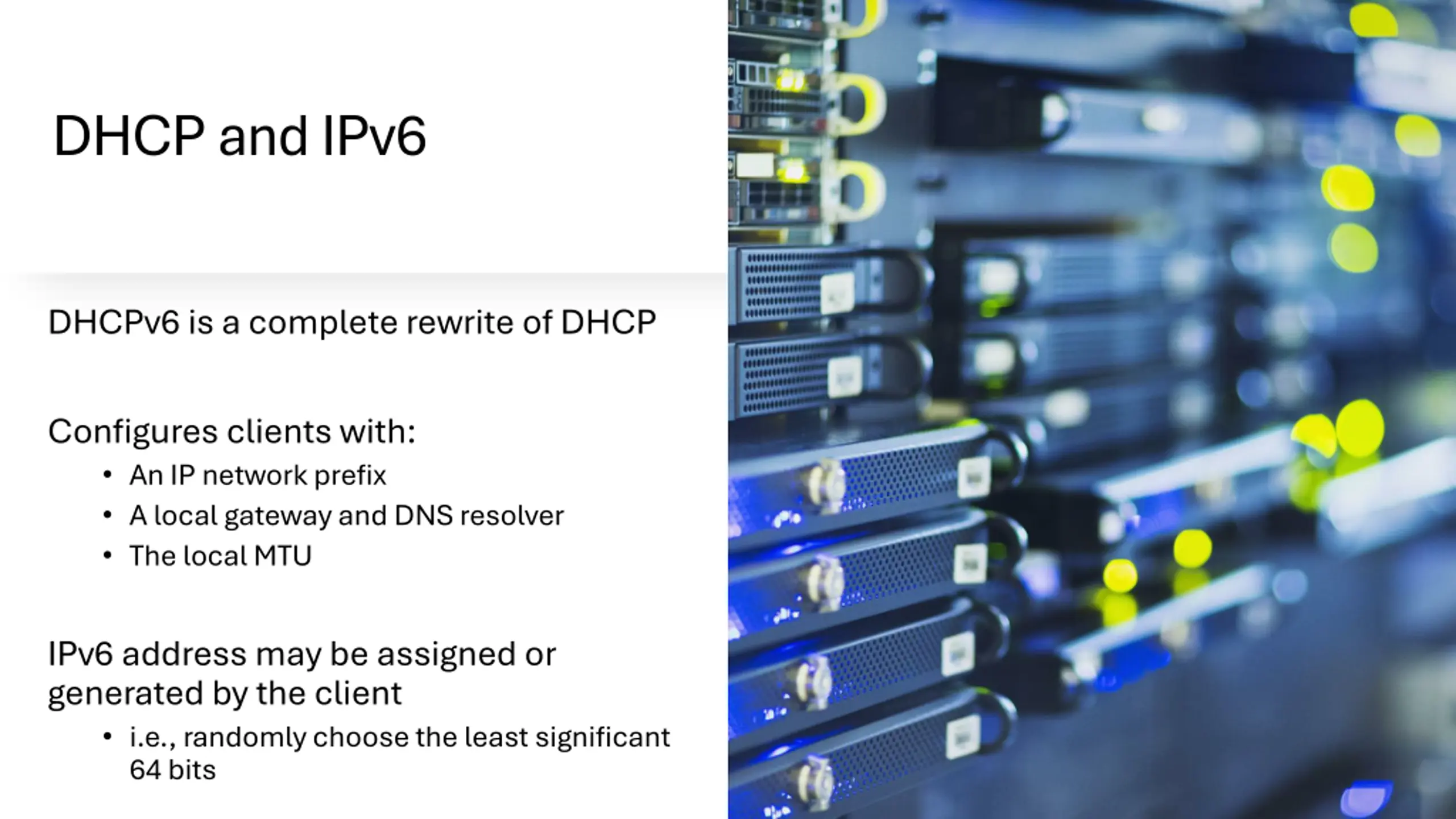 DHCP and IPv6 DHCPv6 is a complete rewrite of DHCP Configures clients with: An IP network prefix A local gateway and DNS resolver The local MTU IPv6 address may be assigned or generated by the client i.e., randomly choose the least significant 64 bits