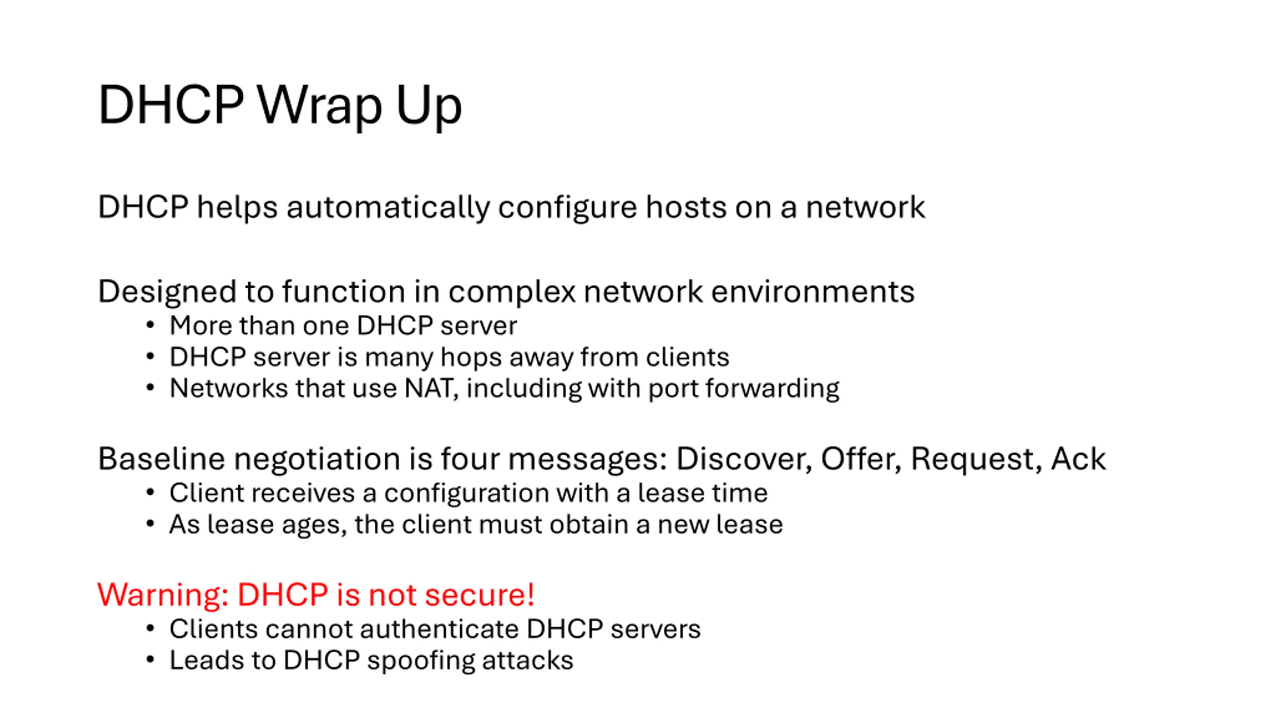 DHCP Wrap Up DHCP helps automatically configure hosts on a network Designed to function in complex network environments More than one DHCP server DHCP server is many hops away from clients Networks that use NAT, including with port forwarding Baseline negotiation is four messages: Discover, Offer, Request, Ack Client receives a configuration with a lease time As lease ages, the client must obtain a new lease Warning: DHCP is not secure! Clients cannot authenticate DHCP servers Leads to DHCP spoofing attacks