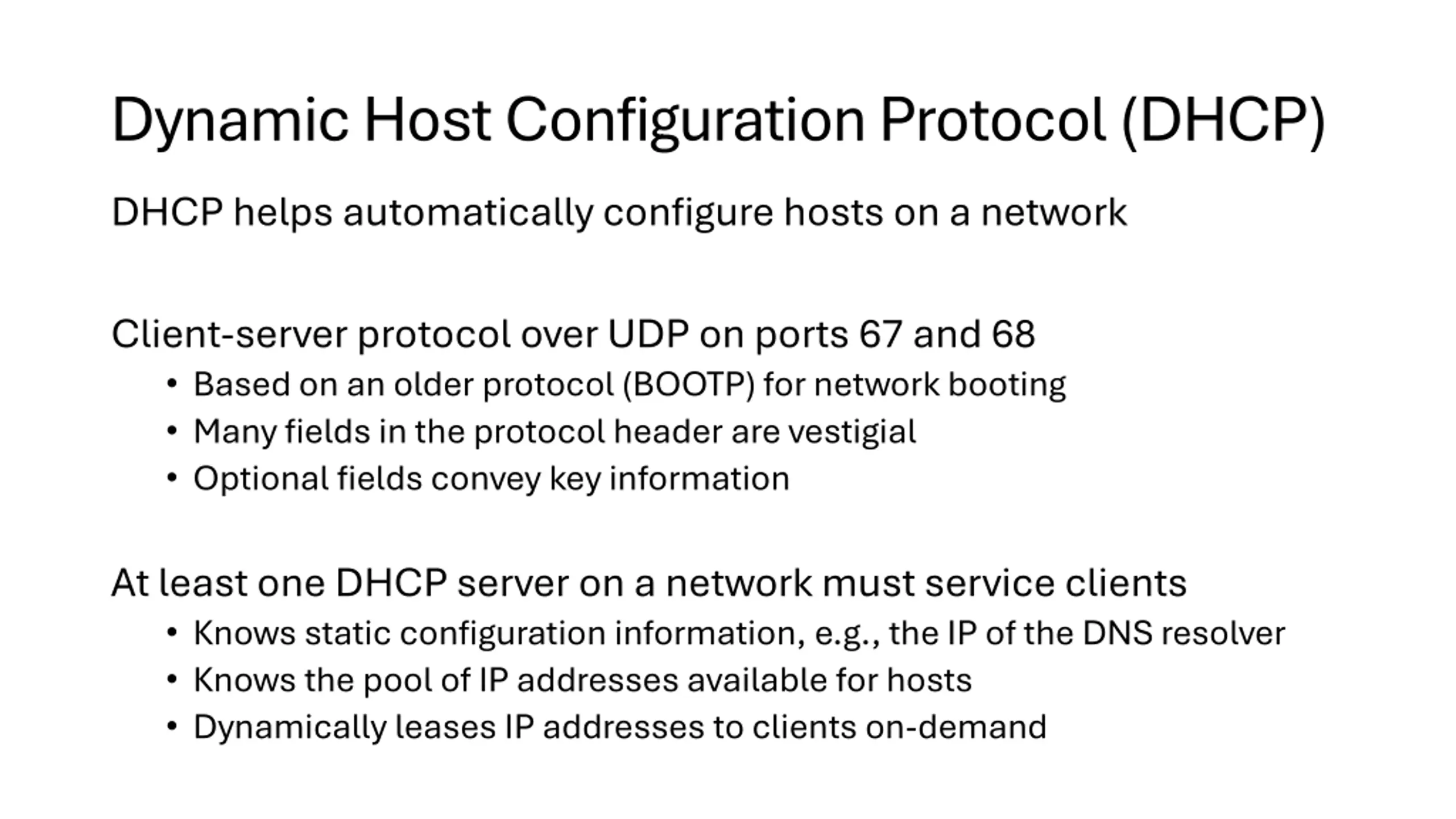 Dynamic Host Configuration Protocol (DHCP) DHCP helps automatically configure hosts on a network Client-server protocol over UDP on ports 67 and 68 Based on an older protocol (BOOTP) for network booting Many fields in the protocol header are vestigial Optional fields convey key information At least one DHCP server on a network must service clients Knows static configuration information, e.g., the IP of the DNS resolver Knows the pool of IP addresses available for hosts Dynamically leases IP addresses to clients on-demand
