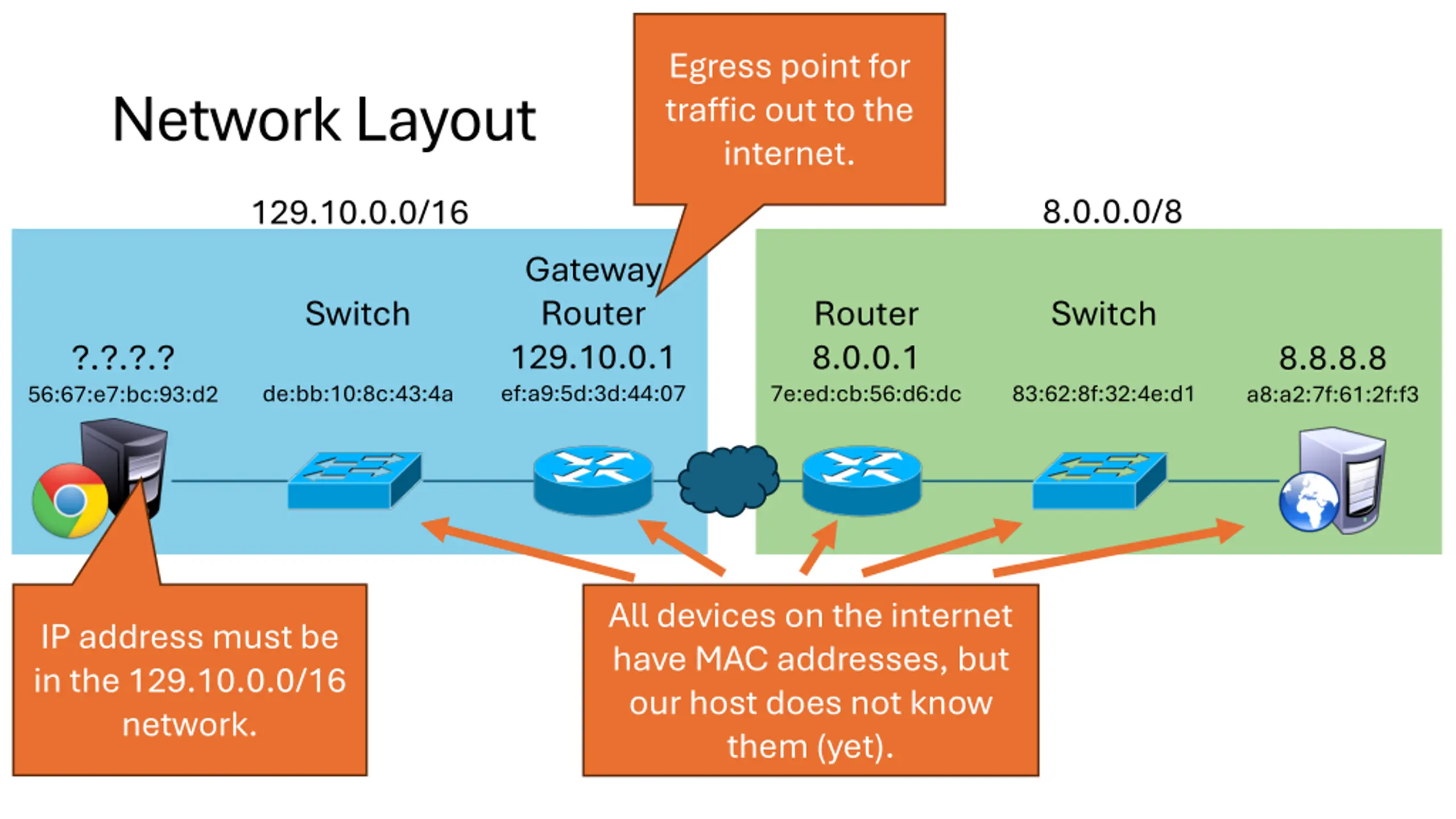 Egress point for traffic out to the internet. Network Layout 8.0.0.0/8 129.10.0.0/16 Gateway Router 129.10.0.1 ef:a9:5d:3d:44:07 Switch Router 8.0.0.1 7e:ed:cb:56:d6:dc Switch ?.?.?.? 56:67:e7:bc:93:d2 8.8.8.8 a8:a2:7f:61:2f:f3 de:bb:10:8c:43:4a 83:62:8f:32:4e:d1 All devices on the internet have MAC addresses, but our host does not know them (yet). IP address must be in the 129.10.0.0/16 network.