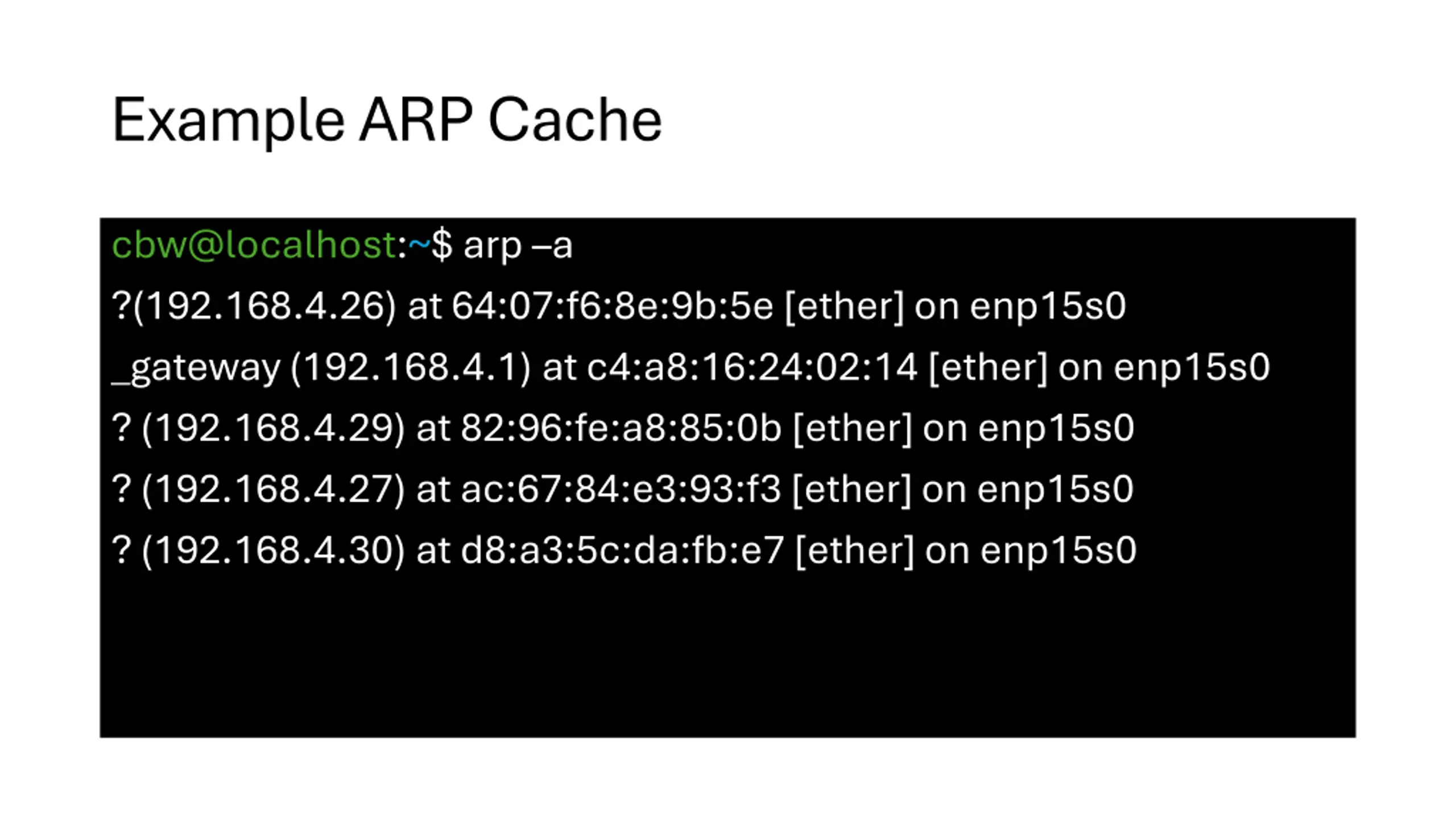 Example ARP Cache cbw@localhost:~$ arp a ?(192.168.4.26) at 64:07:f6:8e:9b:5e [ether] on enp15s0 _gateway (192.168.4.1) at c4:a8:16:24:02:14 [ether] on enp15s0 ? (192.168.4.29) at 82:96:fe:a8:85:0b [ether] on enp15s0 ? (192.168.4.27) at ac:67:84:e3:93:f3 [ether] on enp15s0 ? (192.168.4.30) at d8:a3:5c:da:fb:e7 [ether] on enp15s0