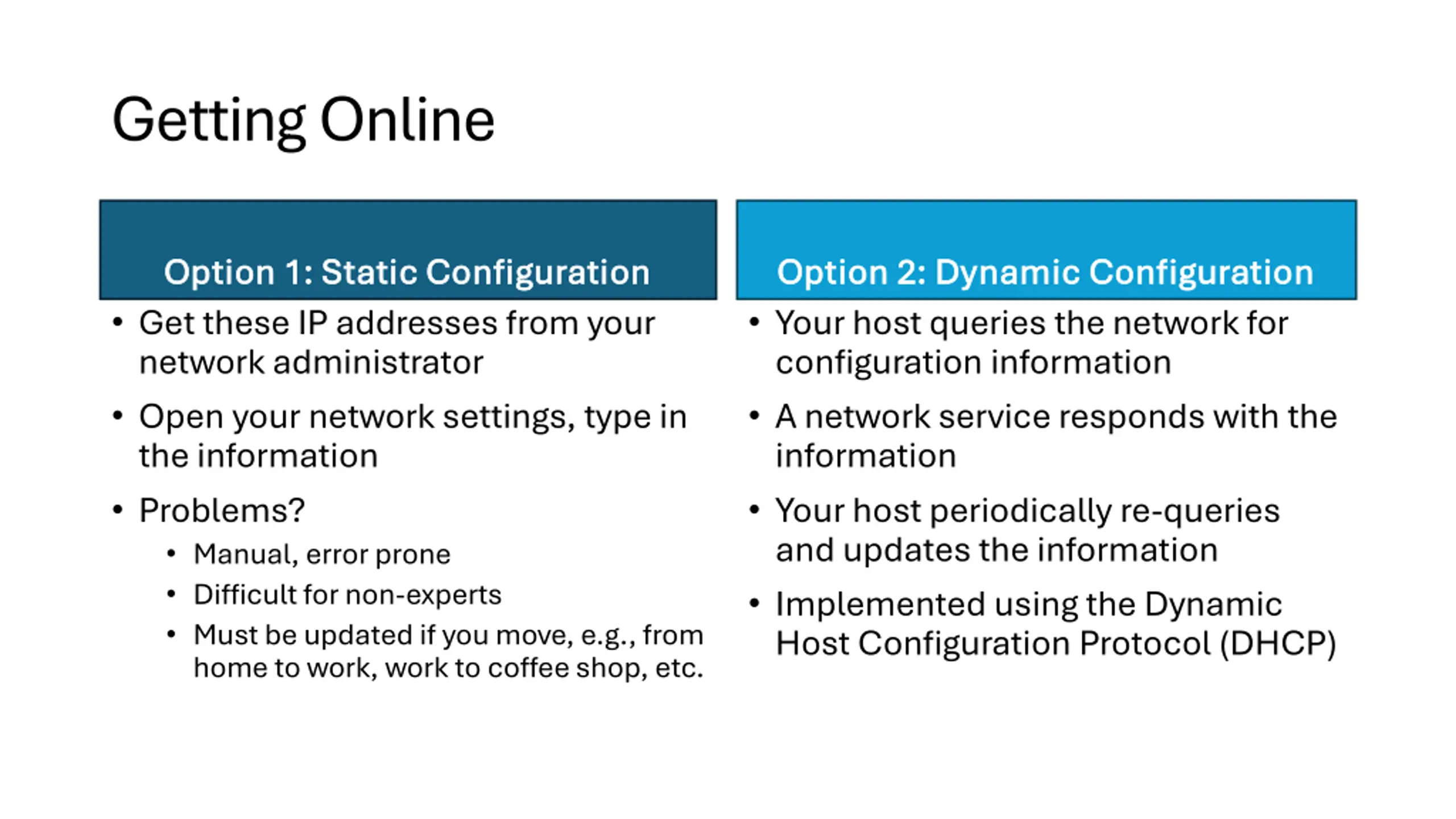 Getting Online Option 1: Static Configuration Option 1: Static Configuration Get these IP addresses from your network administrator Open your network settings, type in the information Problems? Manual, error prone Difficult for non-experts Must be updated if you move, e.g., from home to work, work to coffee shop, etc. Option 2: Dynamic Configuration Option 2: Dynamic Configuration Your host queries the network for configuration information A network service responds with the information Your host periodically re-queries and updates the information Implemented using the Dynamic Host Configuration Protocol (DHCP)