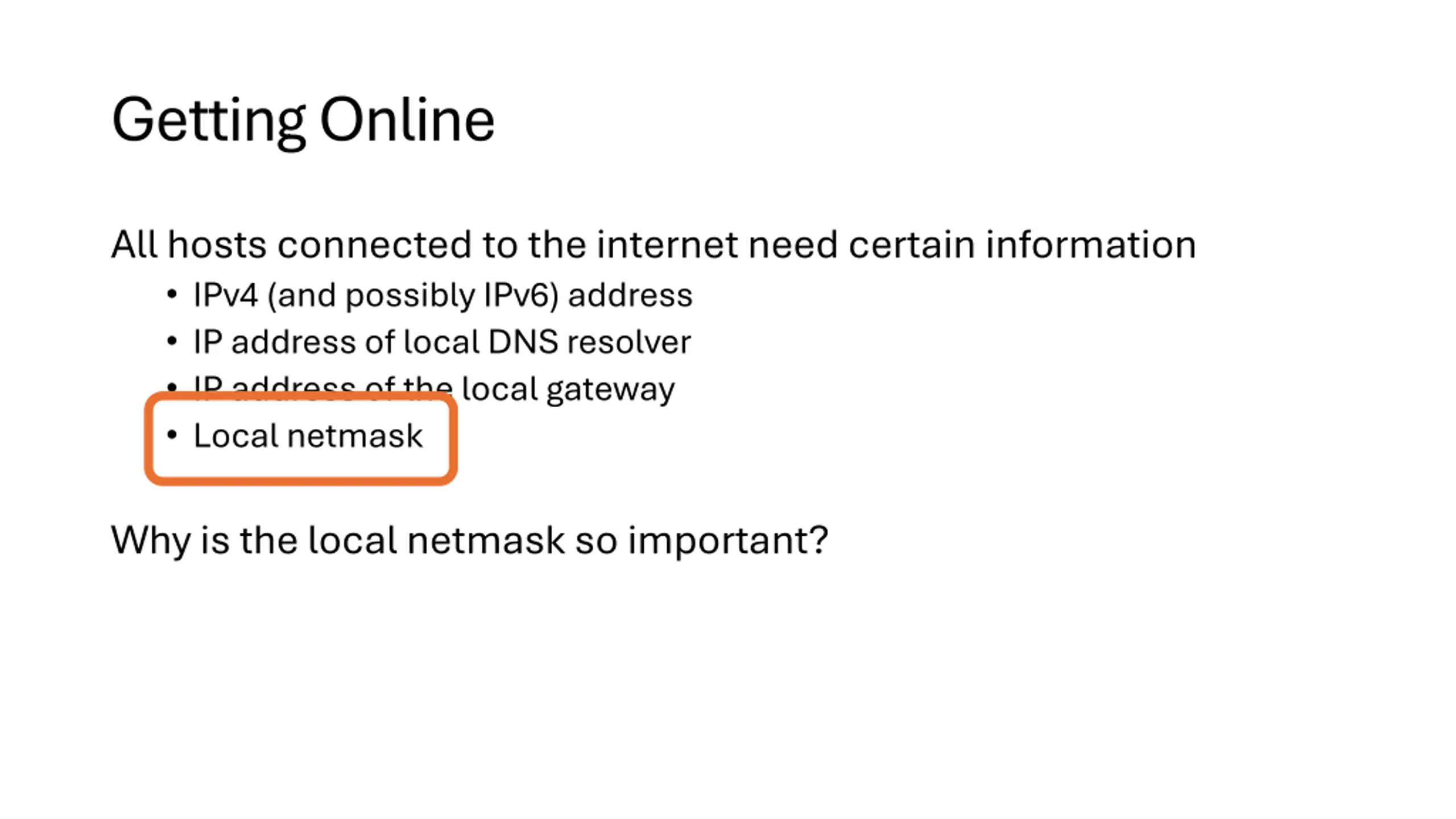 Getting Online All hosts connected to the internet need certain information IPv4 (and possibly IPv6) address IP address of local DNS resolver IP address of the local gateway Local netmask Why is the local netmask so important?