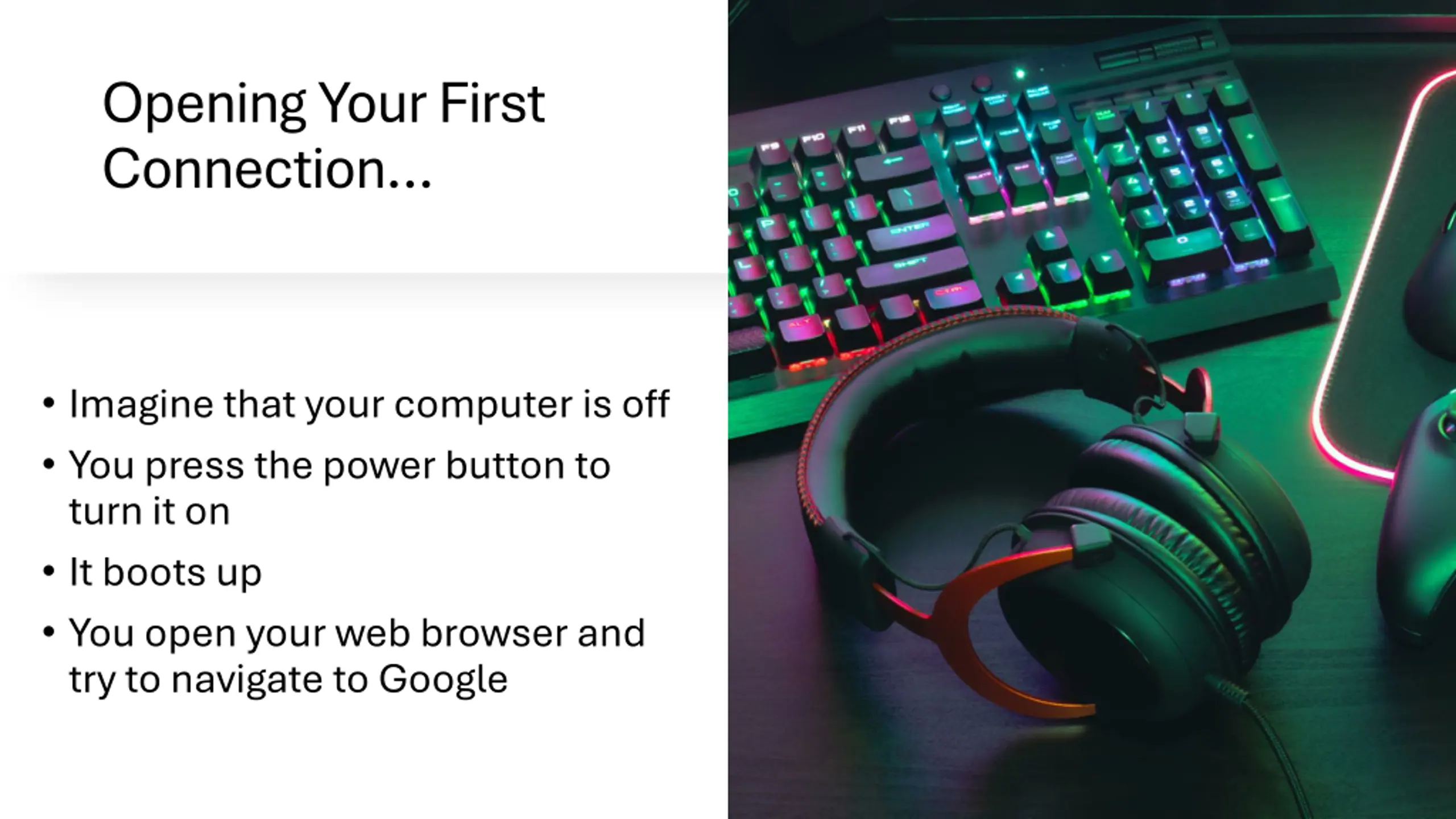 Opening Your First Connection Imagine that your computer is off You press the power button to turn it on It boots up You open your web browser and try to navigate to Google
