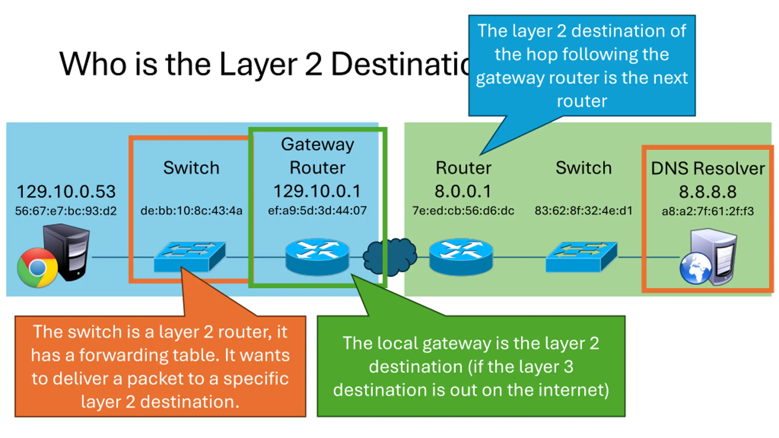 The layer 2 destination of the hop following the gateway router is the next router Who is the Layer 2 Destination? Gateway Router 129.10.0.1 ef:a9:5d:3d:44:07 Switch Router 8.0.0.1 7e:ed:cb:56:d6:dc Switch DNS Resolver 8.8.8.8 a8:a2:7f:61:2f:f3 129.10.0.53 56:67:e7:bc:93:d2 de:bb:10:8c:43:4a 83:62:8f:32:4e:d1 The switch is a layer 2 router, it has a forwarding table. It wants to deliver a packet to a specific layer 2 destination. The local gateway is the layer 2 destination (if the layer 3 destination is out on the internet)
