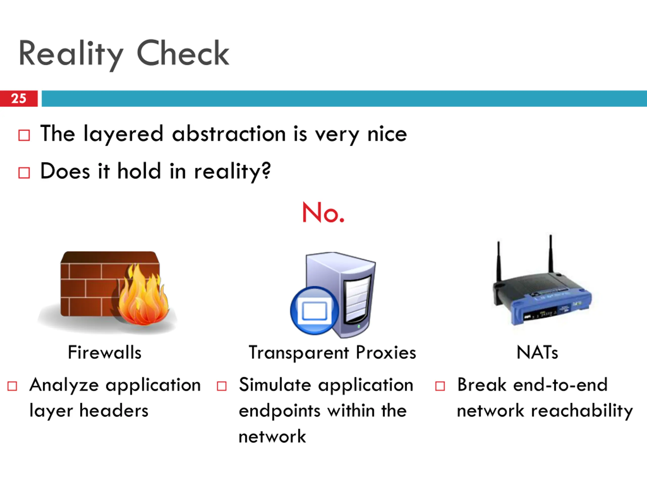 Reality Check 25 The layered abstraction is very nice Does it hold in reality? No. Firewalls Transparent Proxies NATs Analyze application layer headers Simulate application endpoints within the network Break end-to-end network reachability