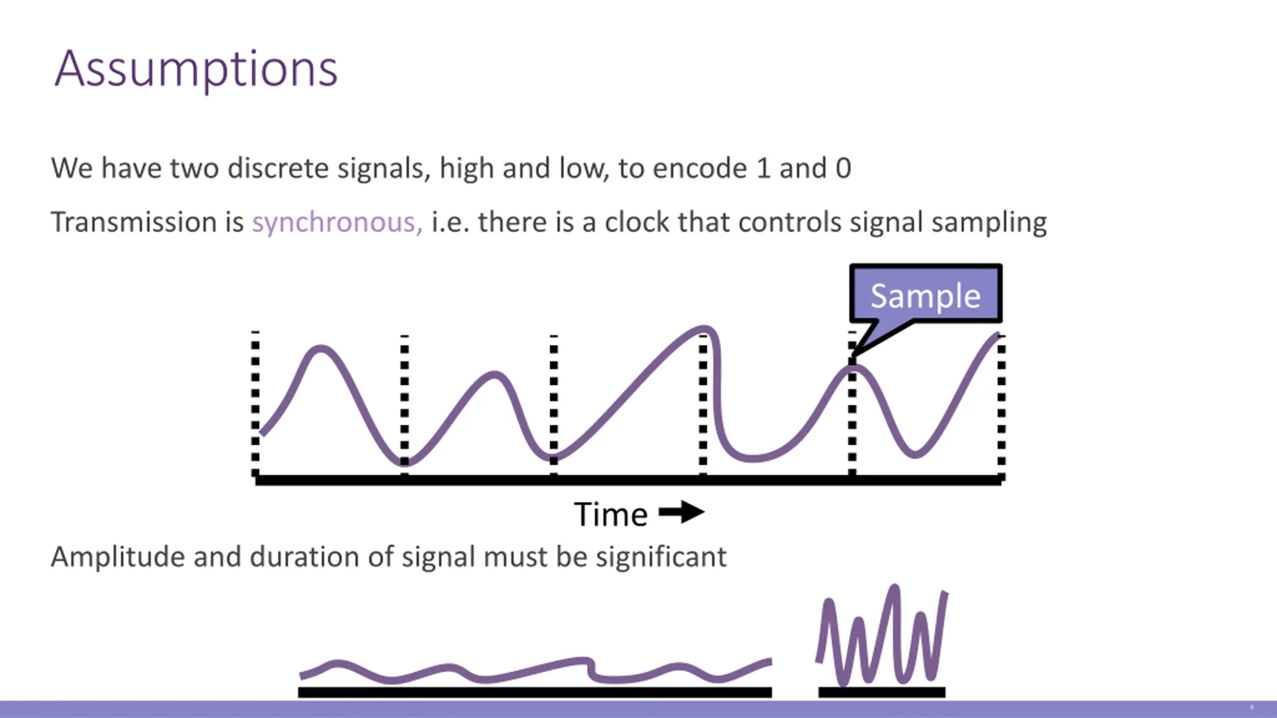 Assumptions We have two discrete signals, high and low, to encode 1 and 0 Transmission is synchronous, i.e. there is a clock that controls signal sampling Sample Time Amplitude and duration of signal must be significant 4