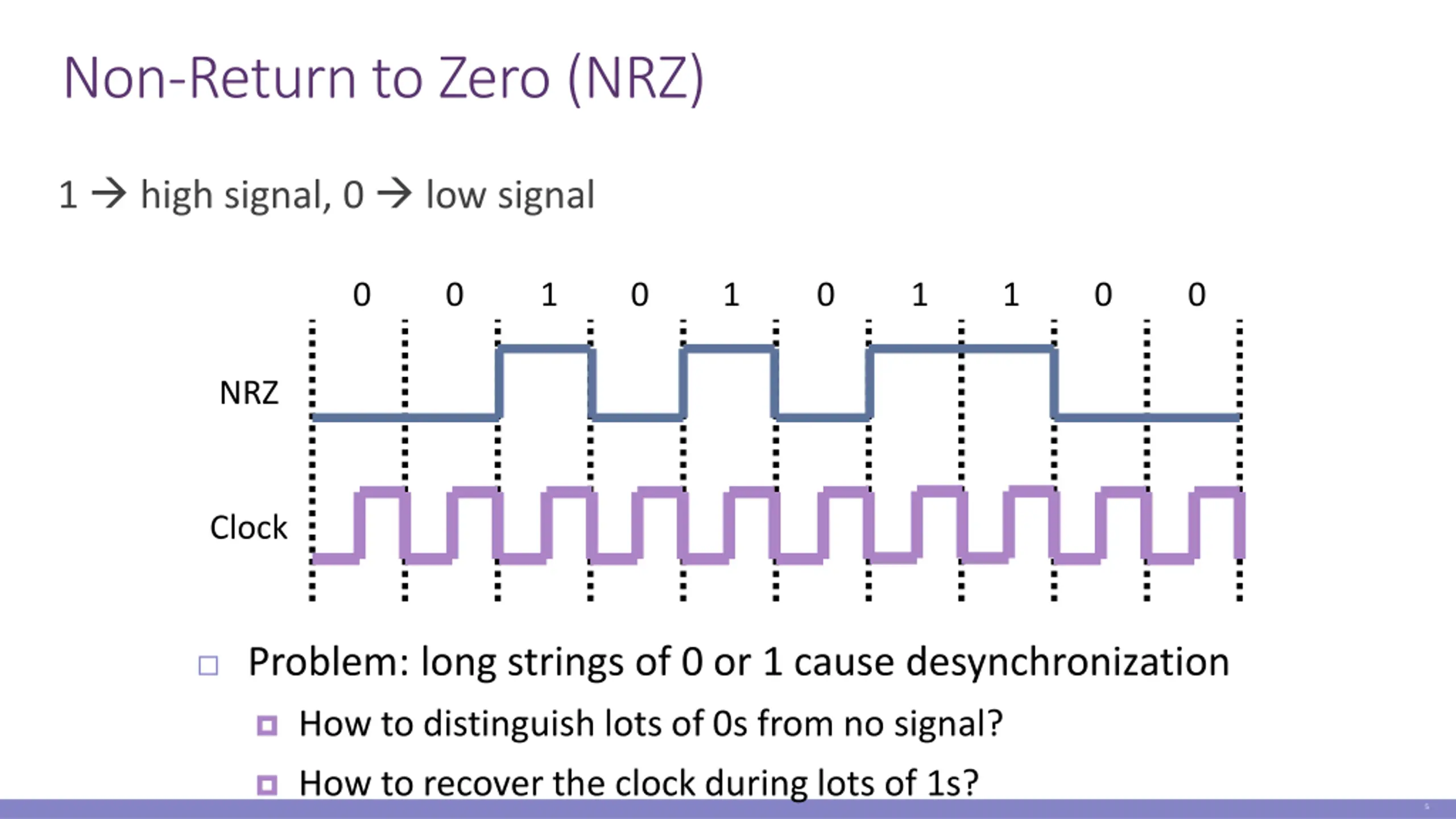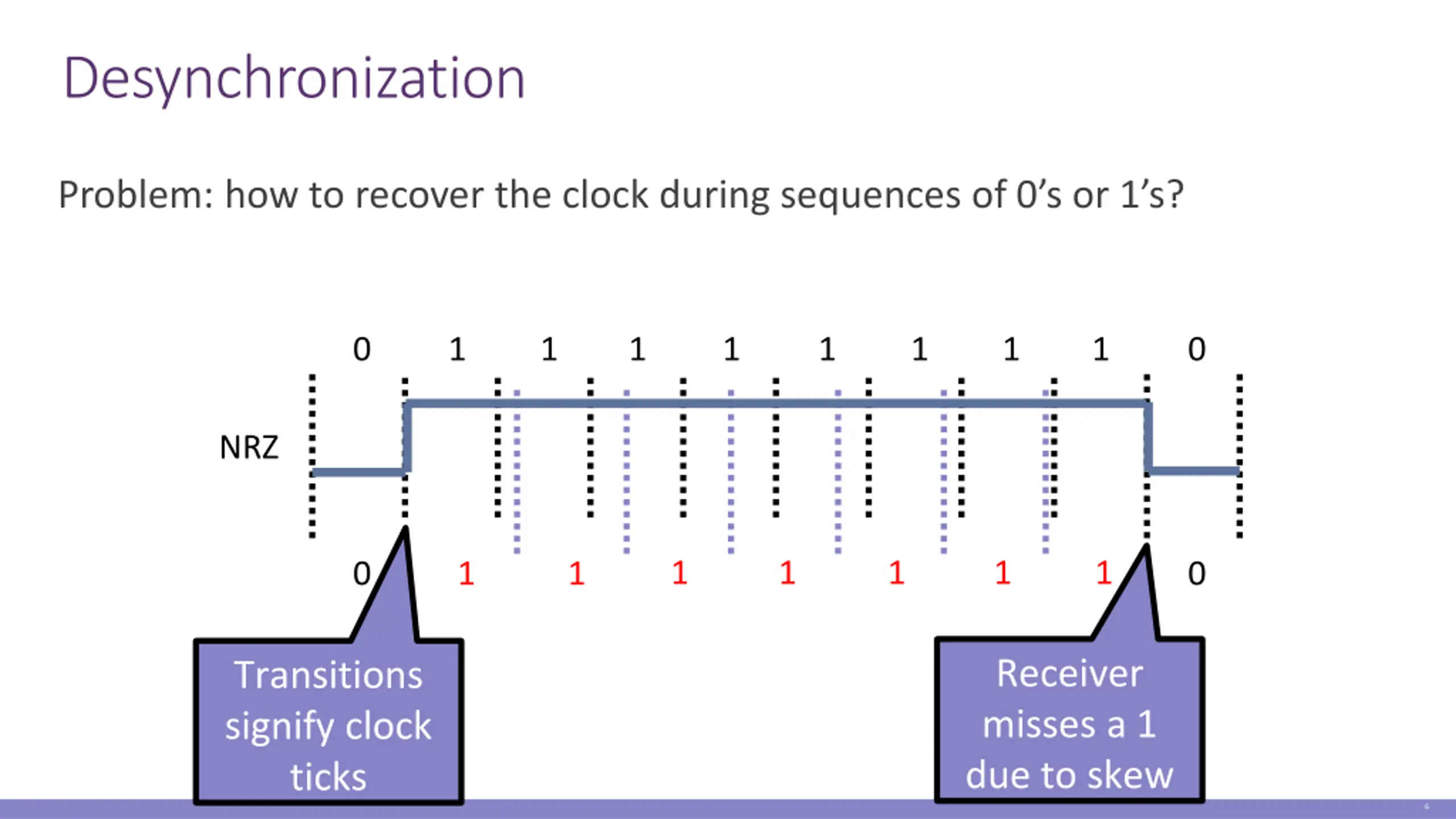 Non-Return to Zero (NRZ) 1 high signal, 0 low signal 0 0 1 0 1 0 1 1 0 0 NRZ Clock Problem: long strings of 0 or 1 cause desynchronization How to distinguish lots of 0s from no signal? How to recover the clock during lots of 1s? 5