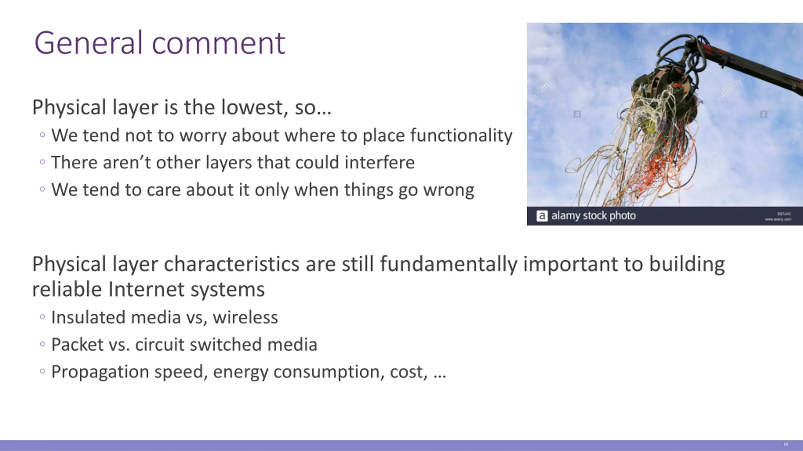 General comment Physical layer is the lowest, so We tend not to worry about where to place functionality There aren t other layers that could interfere We tend to care about it only when things go wrong Physical layer characteristics are still fundamentally important to building reliable Internet systems Insulated media vs, wireless Packet vs. circuit switched media Propagation speed, energy consumption, cost, 10