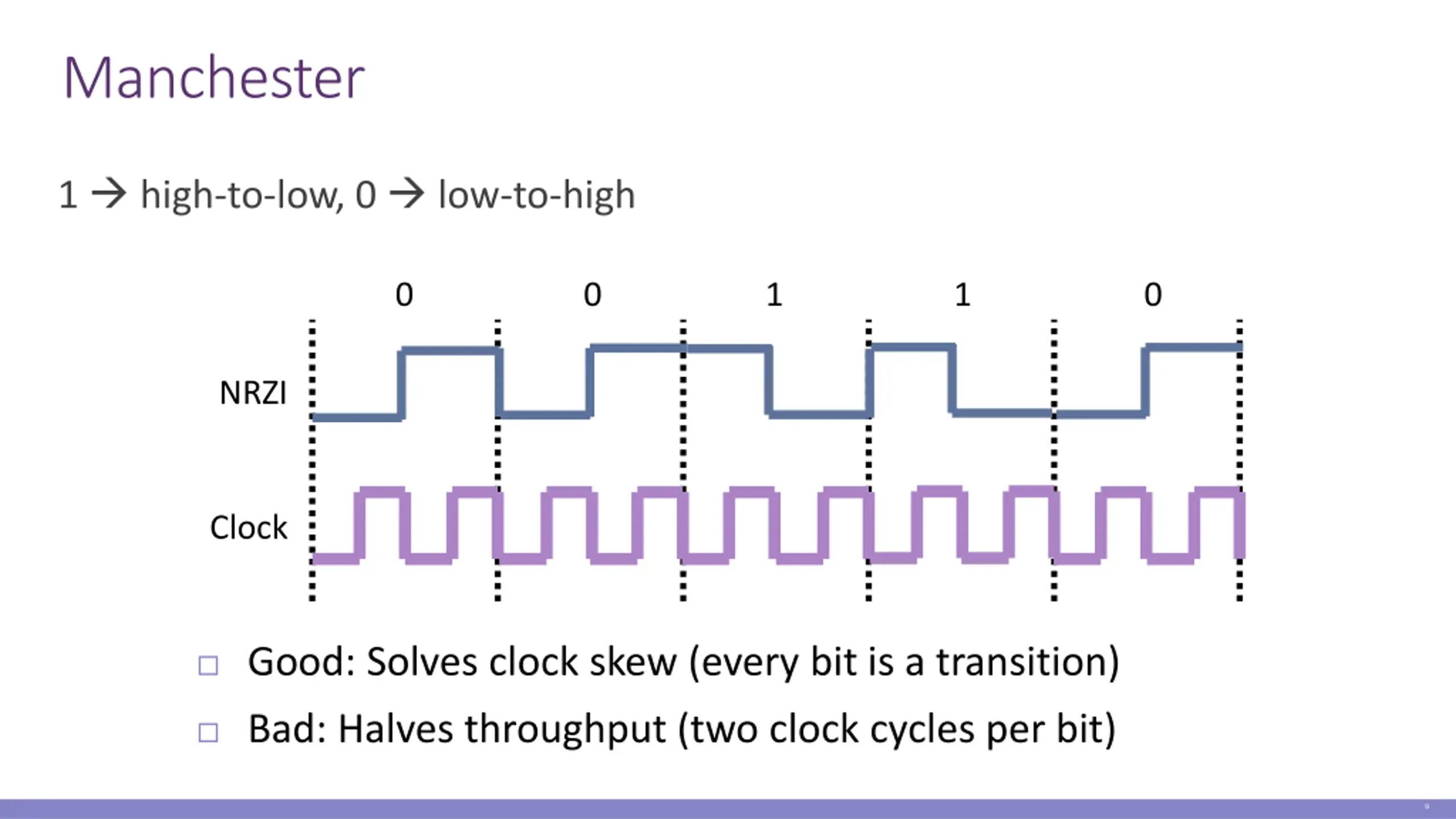 Manchester 1 high-to-low, 0 low-to-high 0 0 1 1 0 NRZI Clock Good: Solves clock skew (every bit is a transition) Bad: Halves throughput (two clock cycles per bit) 9