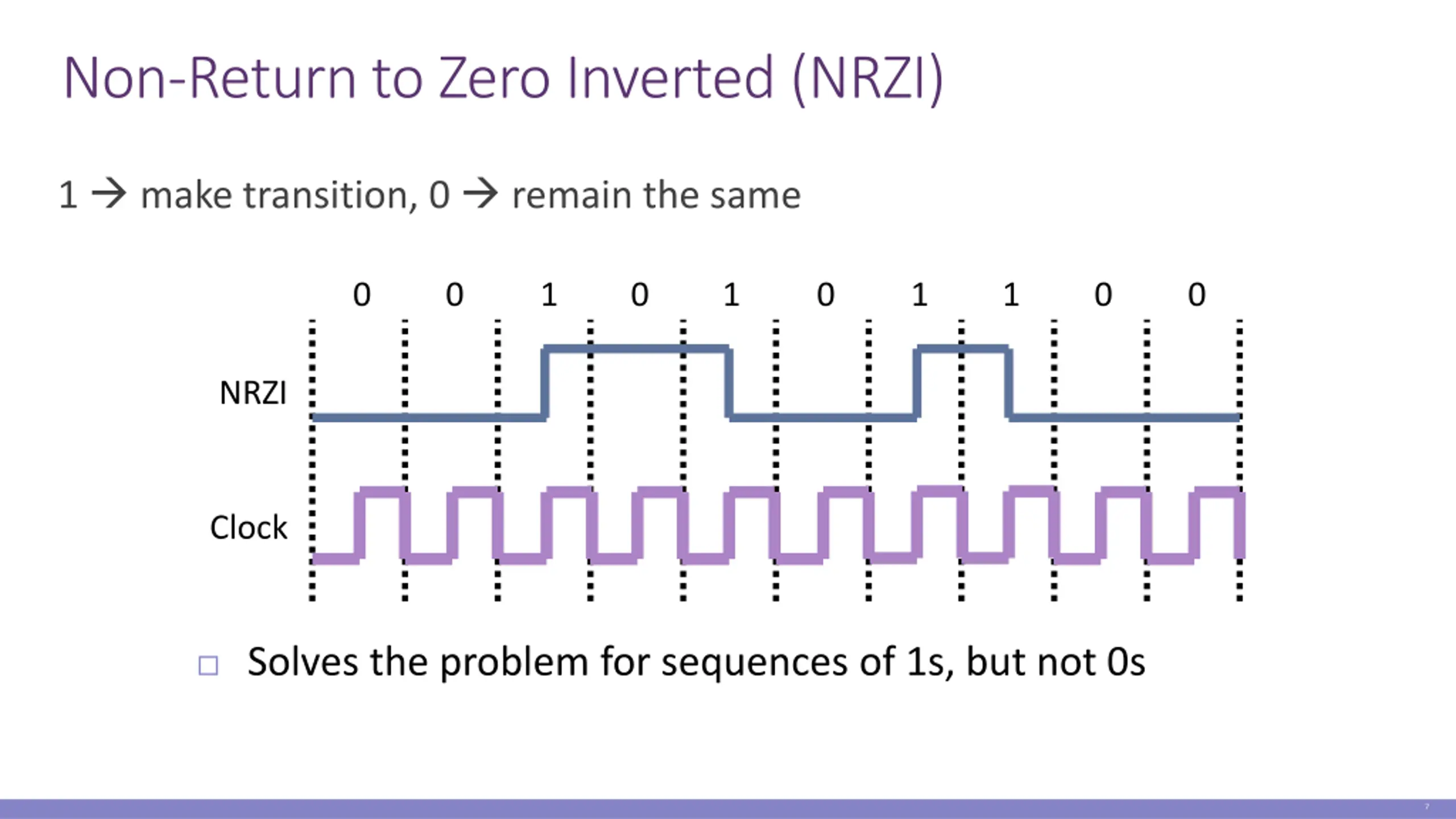 Desynchronization Problem: how to recover the clock during sequences of 0 s or 1 s? 0 1 1 1 1 1 1 1 1 0 NRZ 1 1 1 1 1 0 1 1 0 Receiver misses a 1 due to skew Transitions signify clock ticks 6