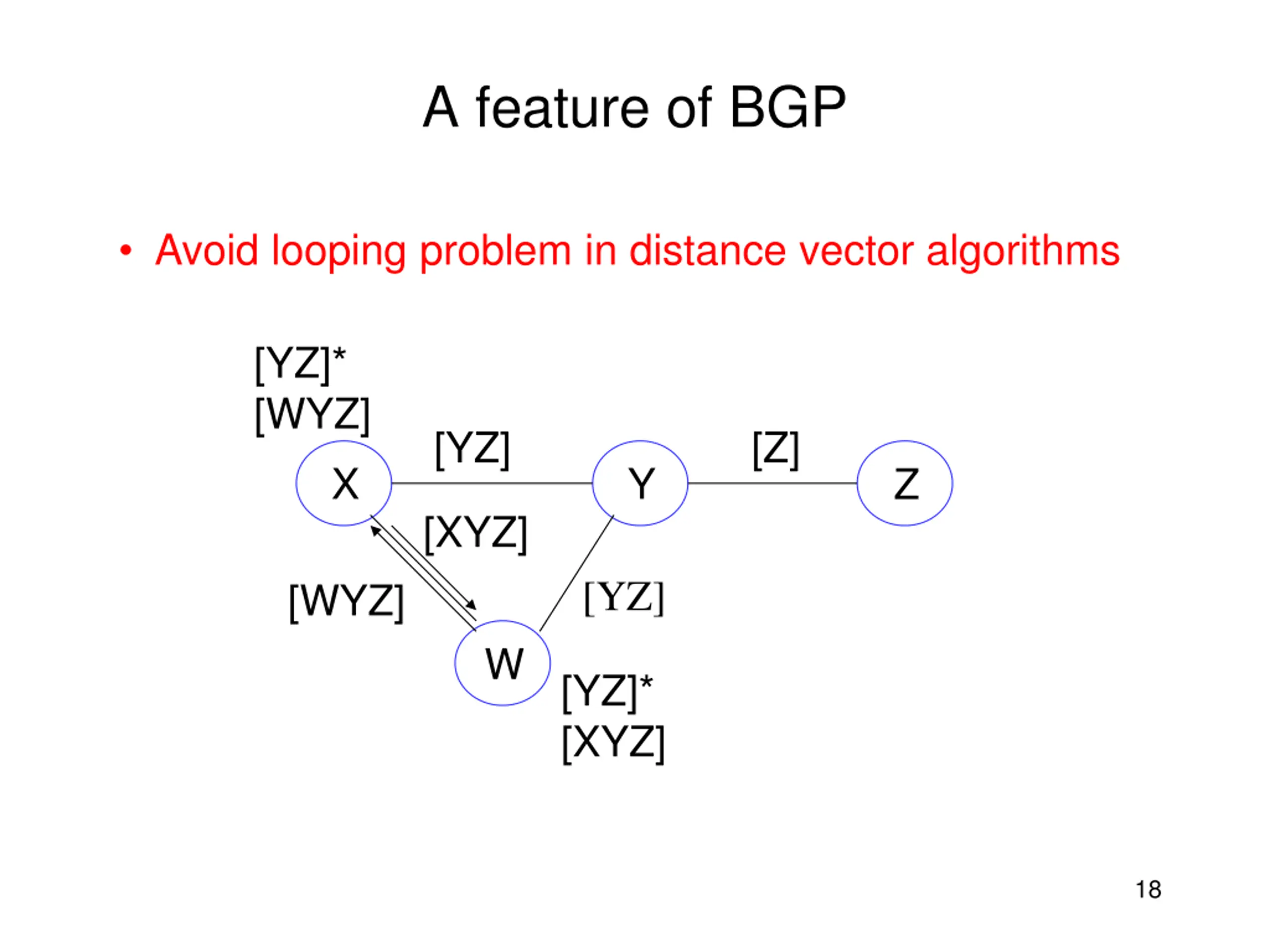 A feature of BGP Avoid looping problem in distance vector algorithms [YZ]* [WYZ] [YZ] [Z] X Y Z [XYZ] [YZ] [WYZ] W [YZ]* [XYZ] 18