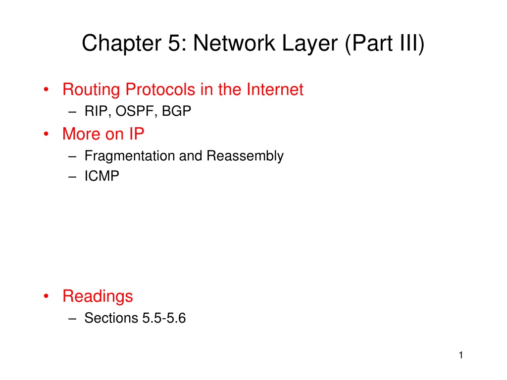 Chapter 5: Network Layer (Part III) Routing Protocols in the Internet RIP, OSPF, BGP More on IP Fragmentation and Reassembly ICMP Readings Sections 5.5-5.6 1