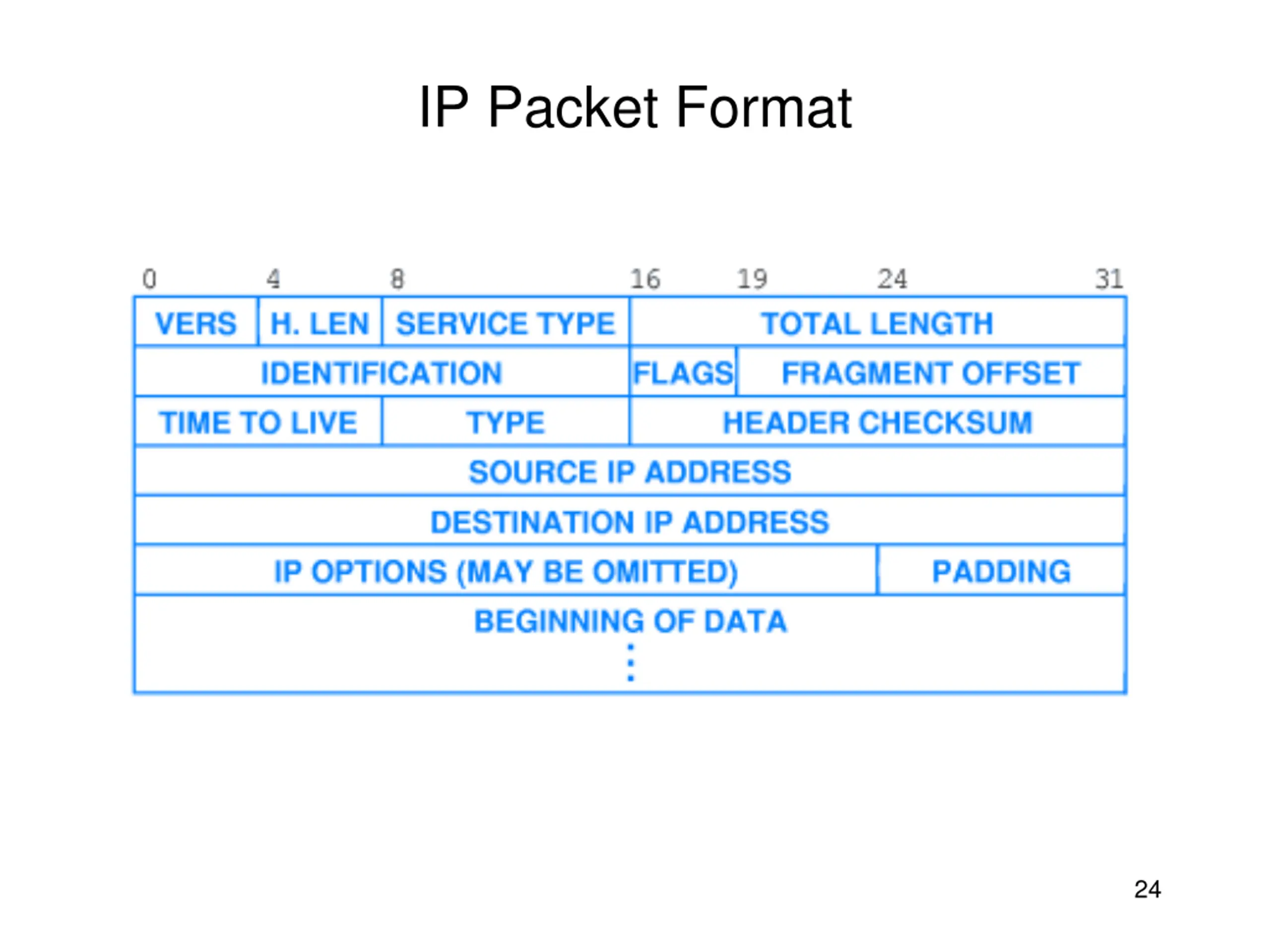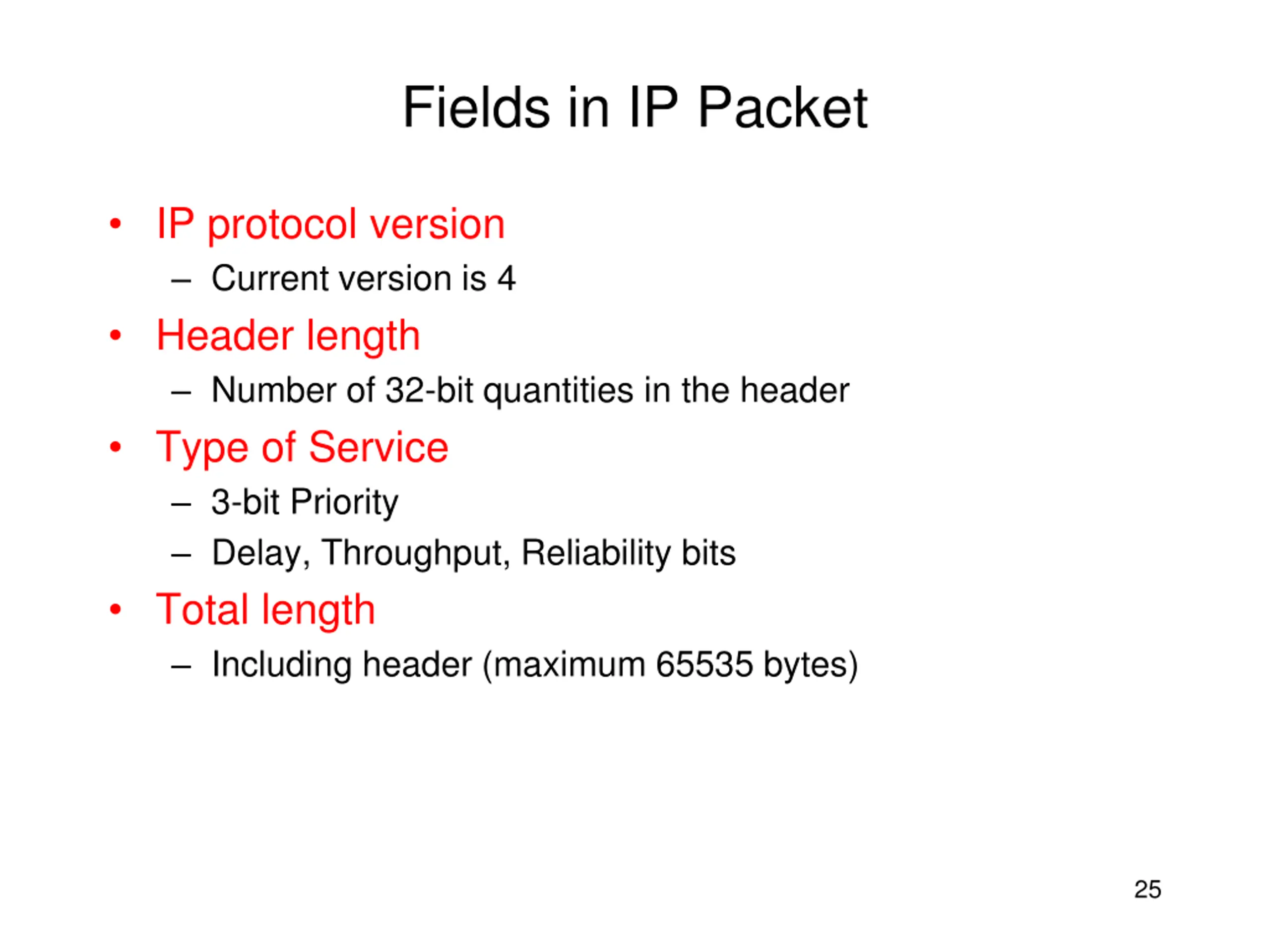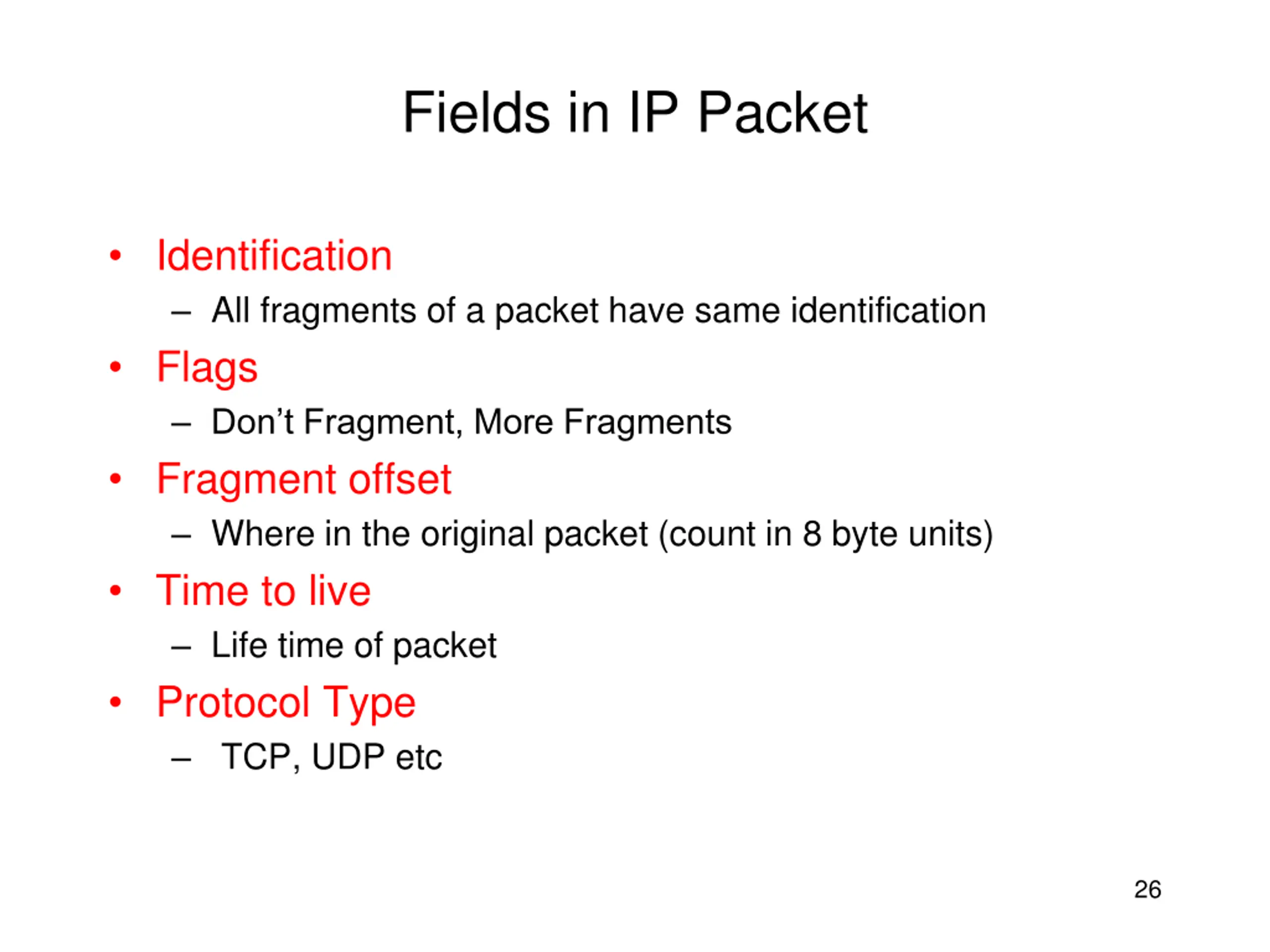 Fields in IP Packet IP protocol version Current version is 4 Header length Number of 32-bit quantities in the header Type of Service 3-bit Priority Delay, Throughput, Reliability bits Total length Including header (maximum 65535 bytes) 25