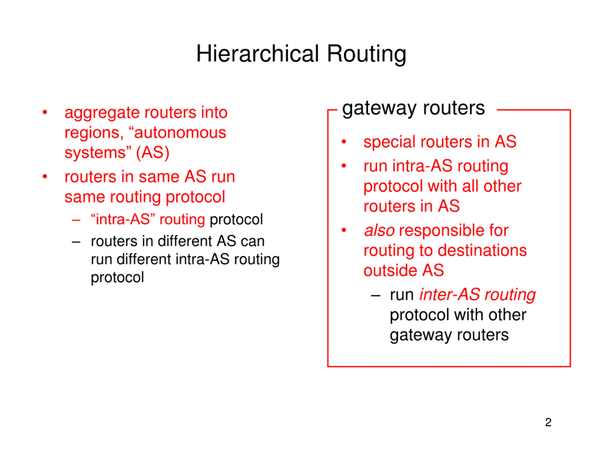 Hierarchical Routing gateway routers aggregate routers into regions, autonomous systems (AS) routers in same AS run same routing protocol intra-AS routing protocol routers in different AS can run different intra-AS routing protocol special routers in AS run intra-AS routing protocol with all other routers in AS also responsible for routing to destinations outside AS run inter-AS routing protocol with other gateway routers 2