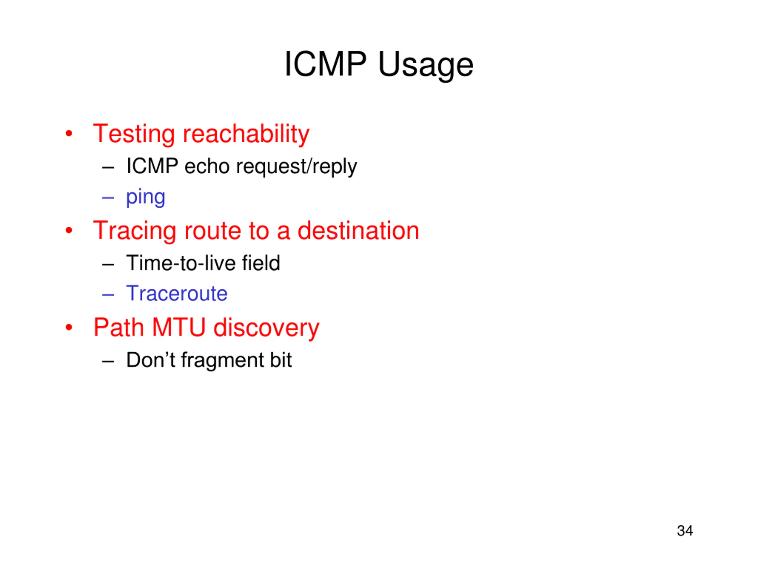 ICMP Usage Testing reachability ICMP echo request/reply ping Tracing route to a destination Time-to-live field Traceroute Path MTU discovery Don t fragment bit 34