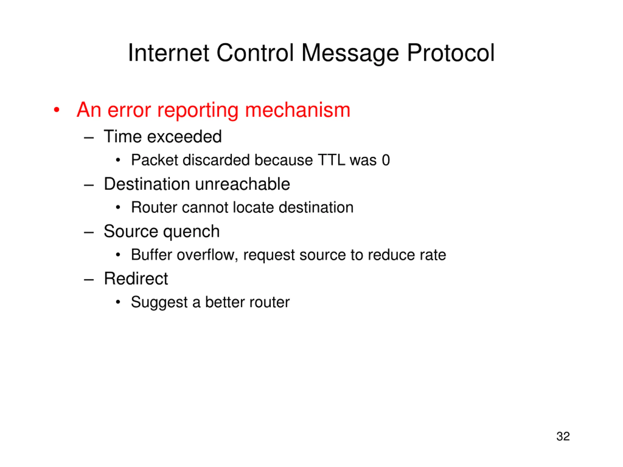 Internet Control Message Protocol An error reporting mechanism Time exceeded Packet discarded because TTL was 0 Destination unreachable Router cannot locate destination Source quench Buffer overflow, request source to reduce rate Redirect Suggest a better router 32
