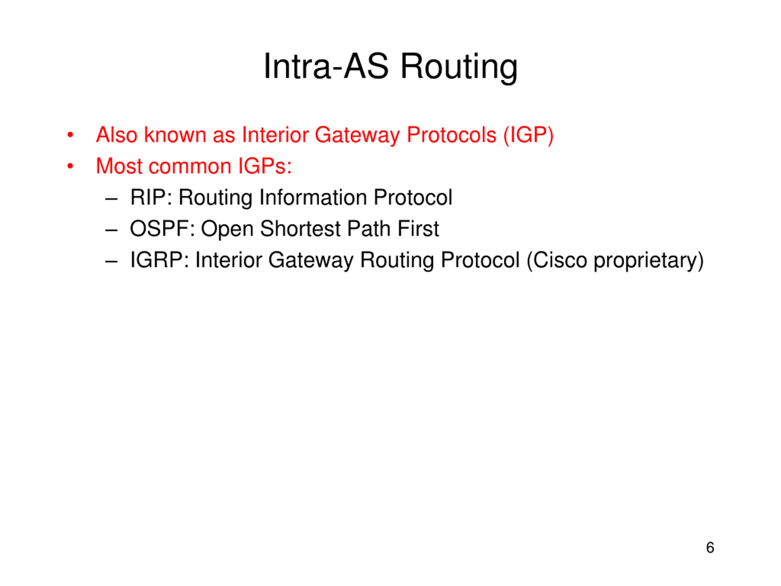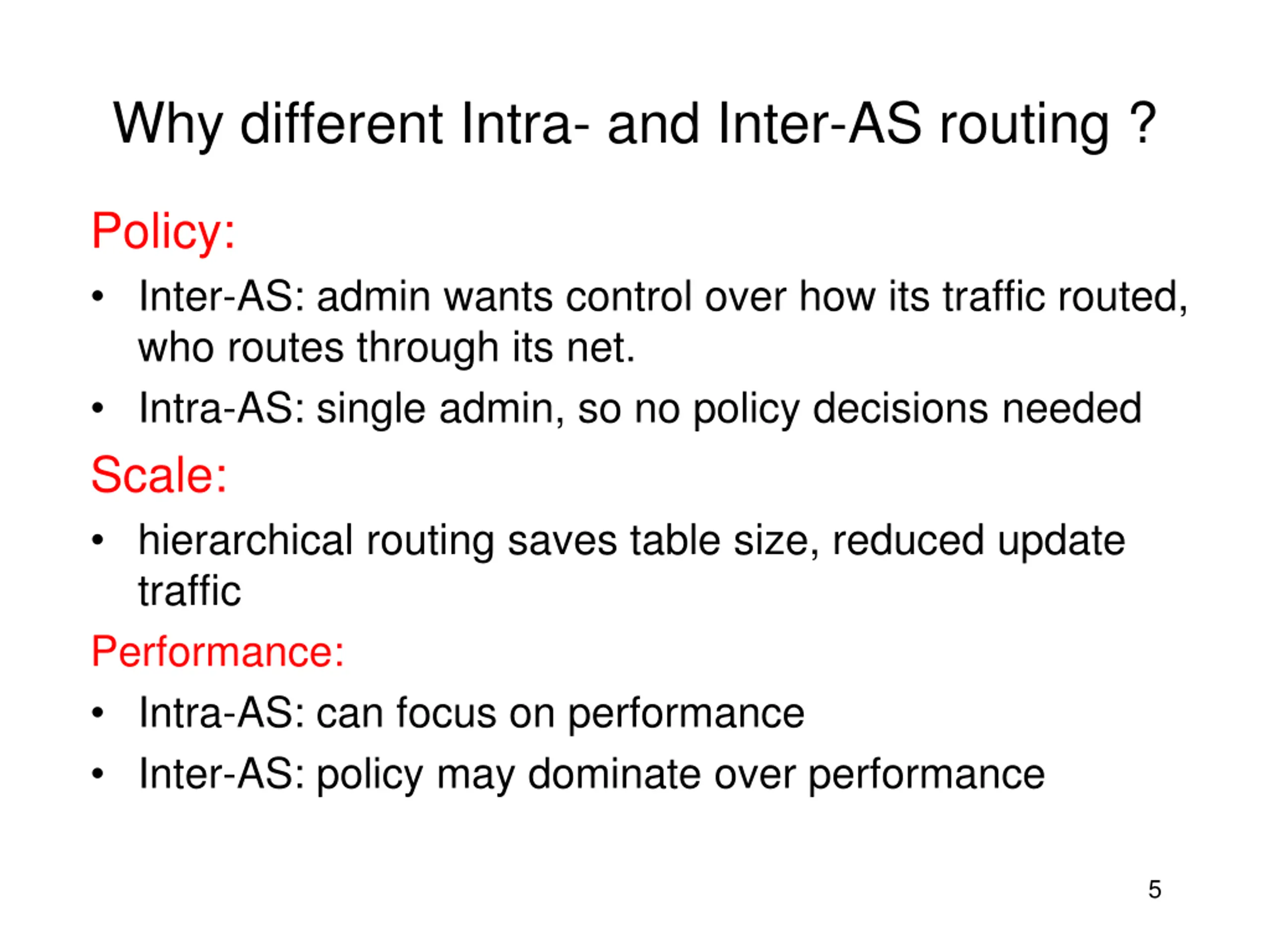 Why different Intra- and Inter-AS routing ? Policy: Inter-AS: admin wants control over how its traffic routed, who routes through its net. Intra-AS: single admin, so no policy decisions needed Scale: hierarchical routing saves table size, reduced update traffic Performance: Intra-AS: can focus on performance Inter-AS: policy may dominate over performance 5