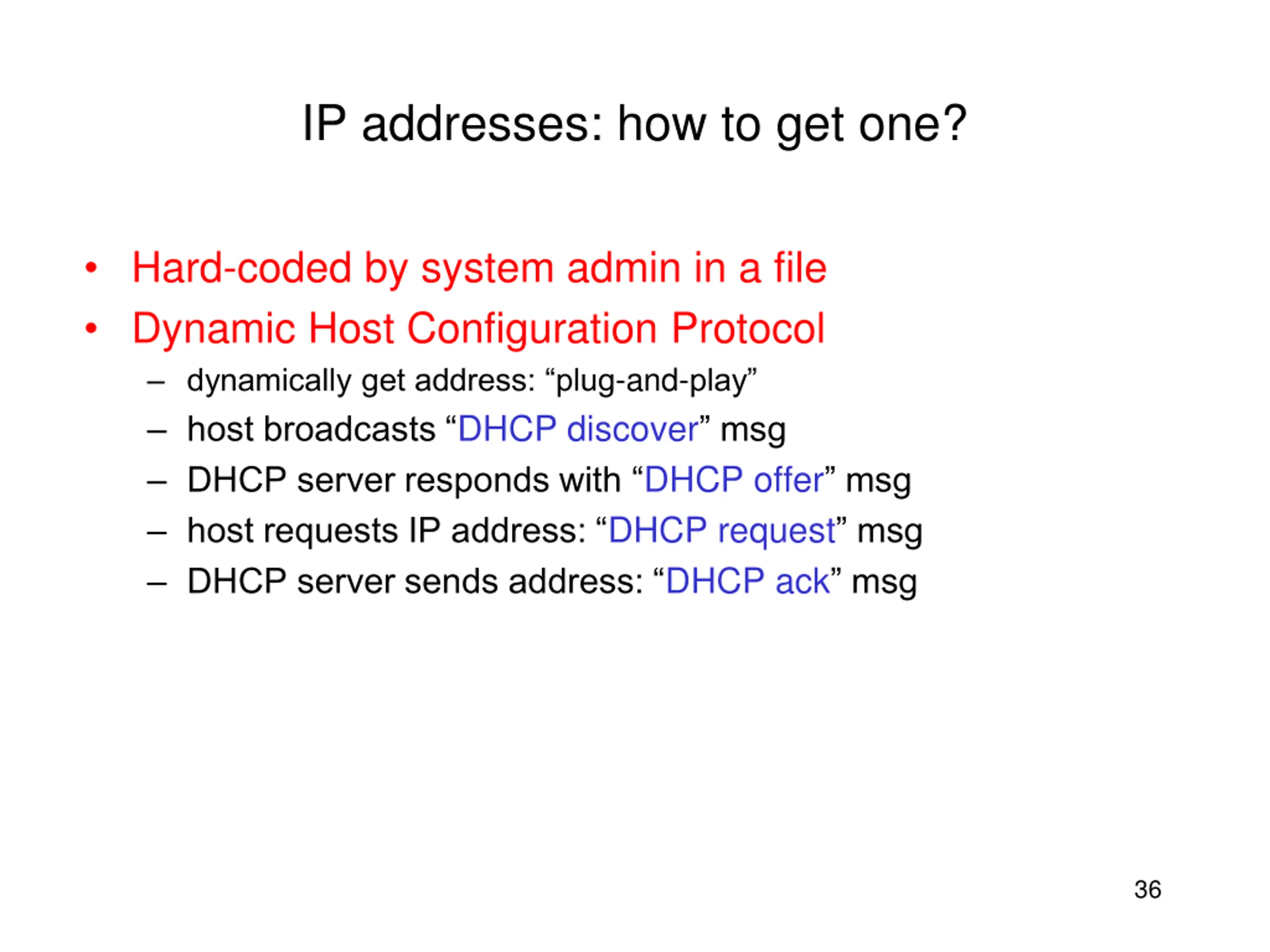 IP addresses: how to get one? Hard-coded by system admin in a file Dynamic Host Configuration Protocol dynamically get address: plug-and-play host broadcasts DHCP discover msg DHCP server responds with DHCP offer msg host requests IP address: DHCP request msg DHCP server sends address: DHCP ack msg 36