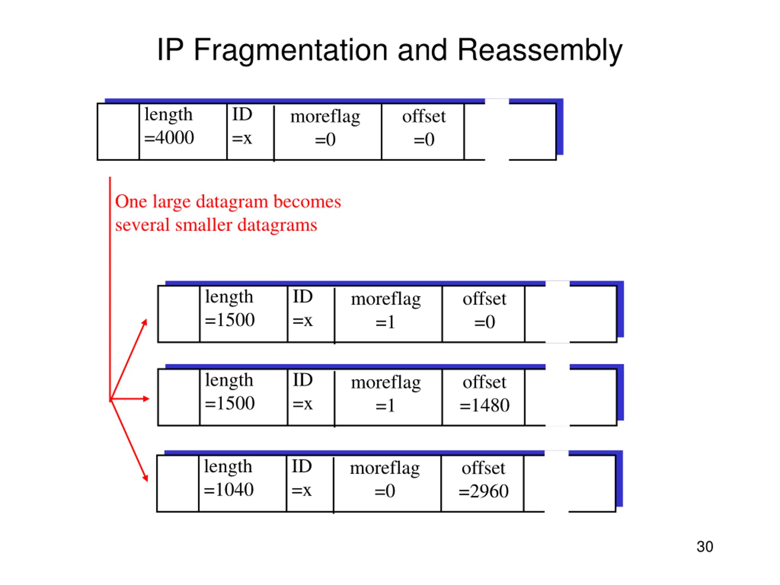 IP Fragmentation and Reassembly length =4000 ID =x moreflag =0 offset =0 One large datagram becomes several smaller datagrams length =1500 ID =x moreflag =1 offset =0 length =1500 ID =x offset =1480 moreflag =1 length =1040 ID =x moreflag =0 offset =2960 30