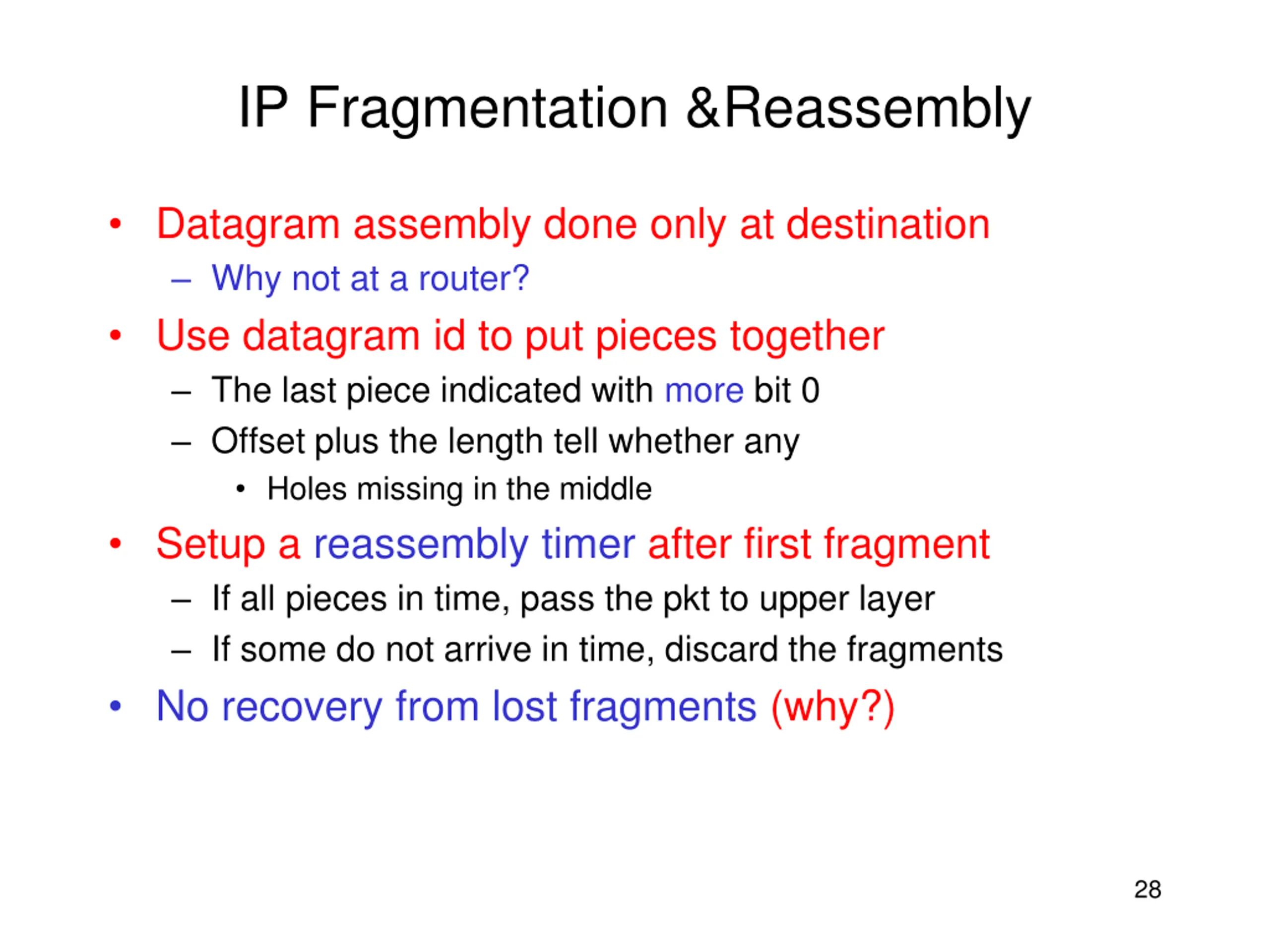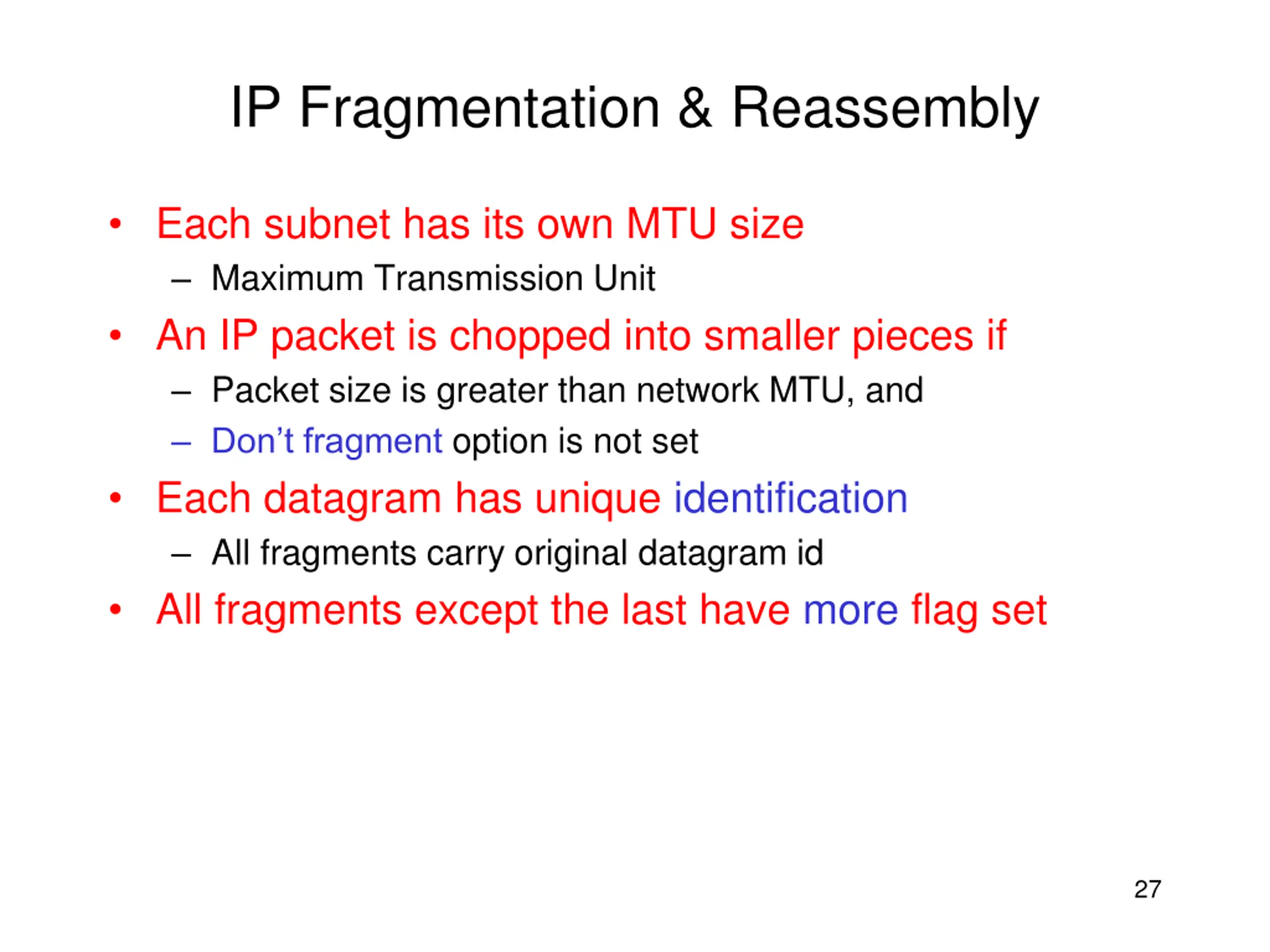 IP Fragmentation & Reassembly Each subnet has its own MTU size Maximum Transmission Unit An IP packet is chopped into smaller pieces if Packet size is greater than network MTU, and Don t fragment option is not set Each datagram has unique identification All fragments carry original datagram id All fragments except the last have more flag set 27