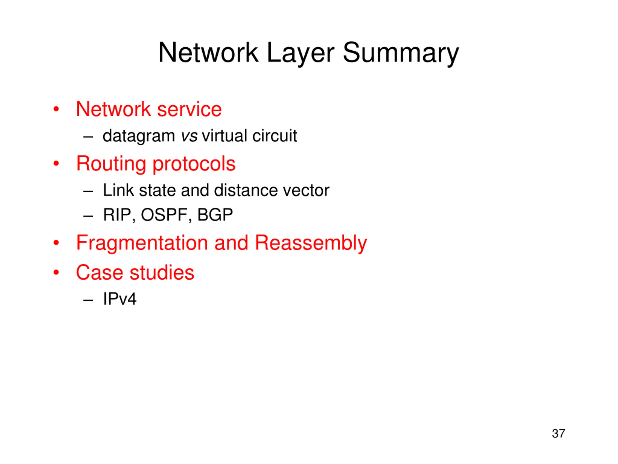 Network Layer Summary Network service datagram vs virtual circuit Routing protocols Link state and distance vector RIP, OSPF, BGP Fragmentation and Reassembly Case studies IPv4 37