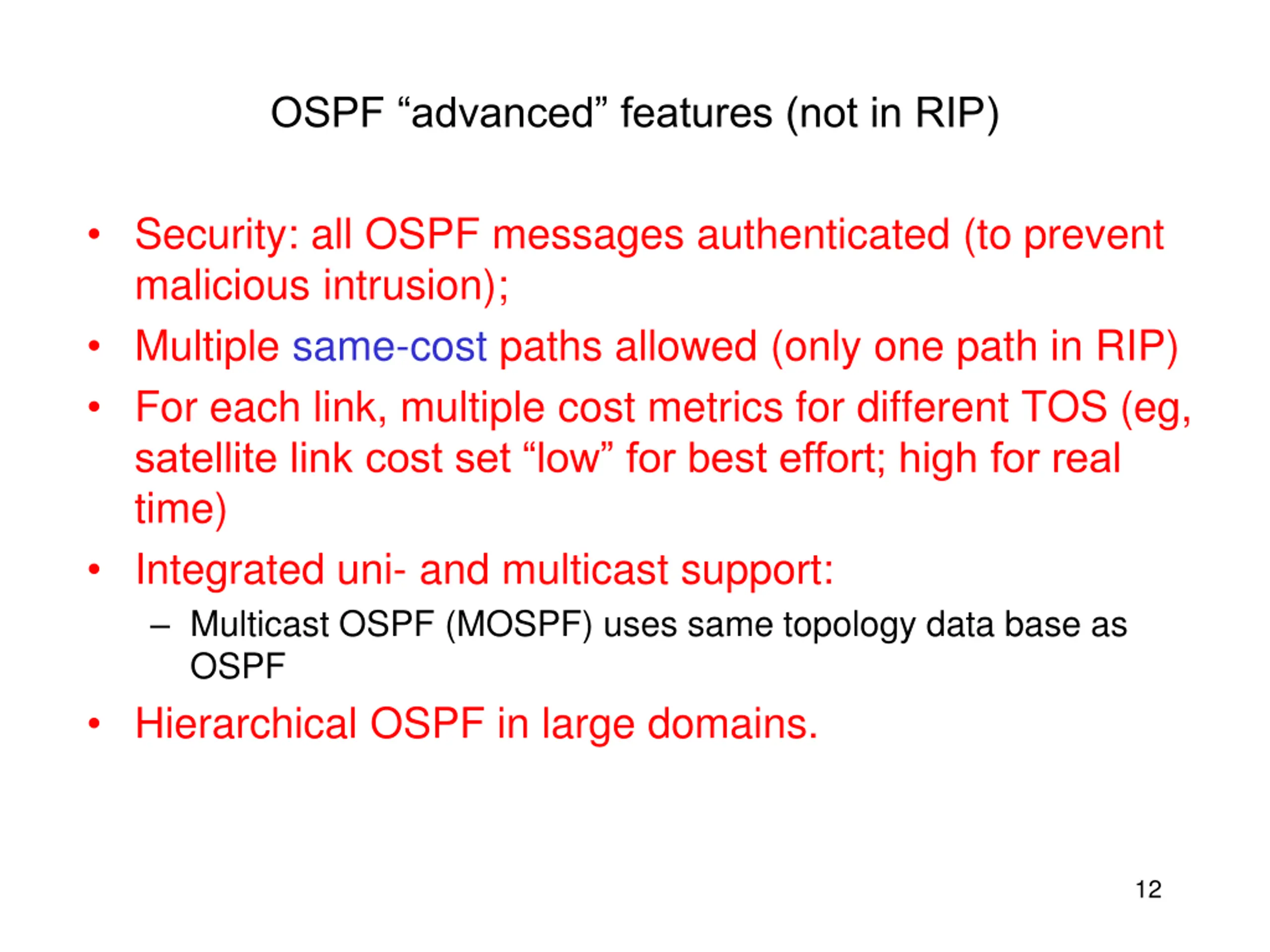 OSPF advanced features (not in RIP) Security: all OSPF messages authenticated (to prevent malicious intrusion); Multiple same-cost paths allowed (only one path in RIP) For each link, multiple cost metrics for different TOS (eg, satellite link cost set low for best effort; high for real time) Integrated uni- and multicast support: Multicast OSPF (MOSPF) uses same topology data base as OSPF Hierarchical OSPF in large domains. 12