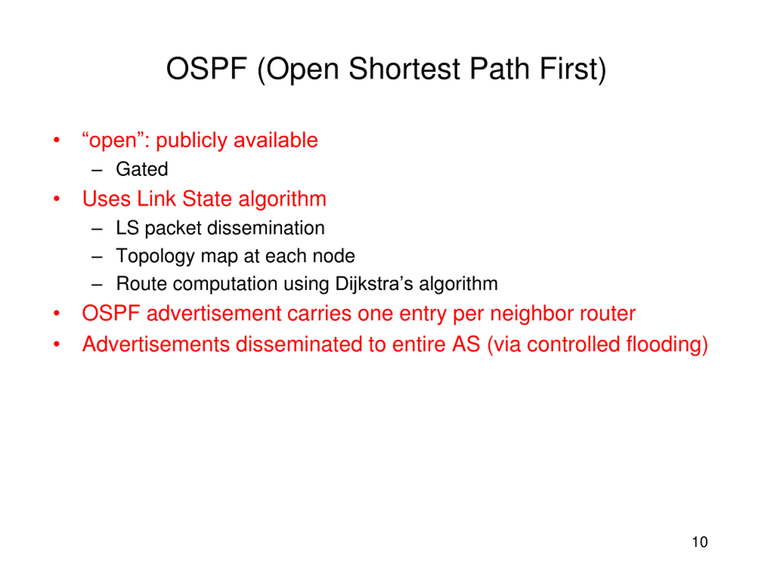 OSPF (Open Shortest Path First) open : publicly available Gated Uses Link State algorithm LS packet dissemination Topology map at each node Route computation using Dijkstra s algorithm OSPF advertisement carries one entry per neighbor router Advertisements disseminated to entire AS (via controlled flooding) 10