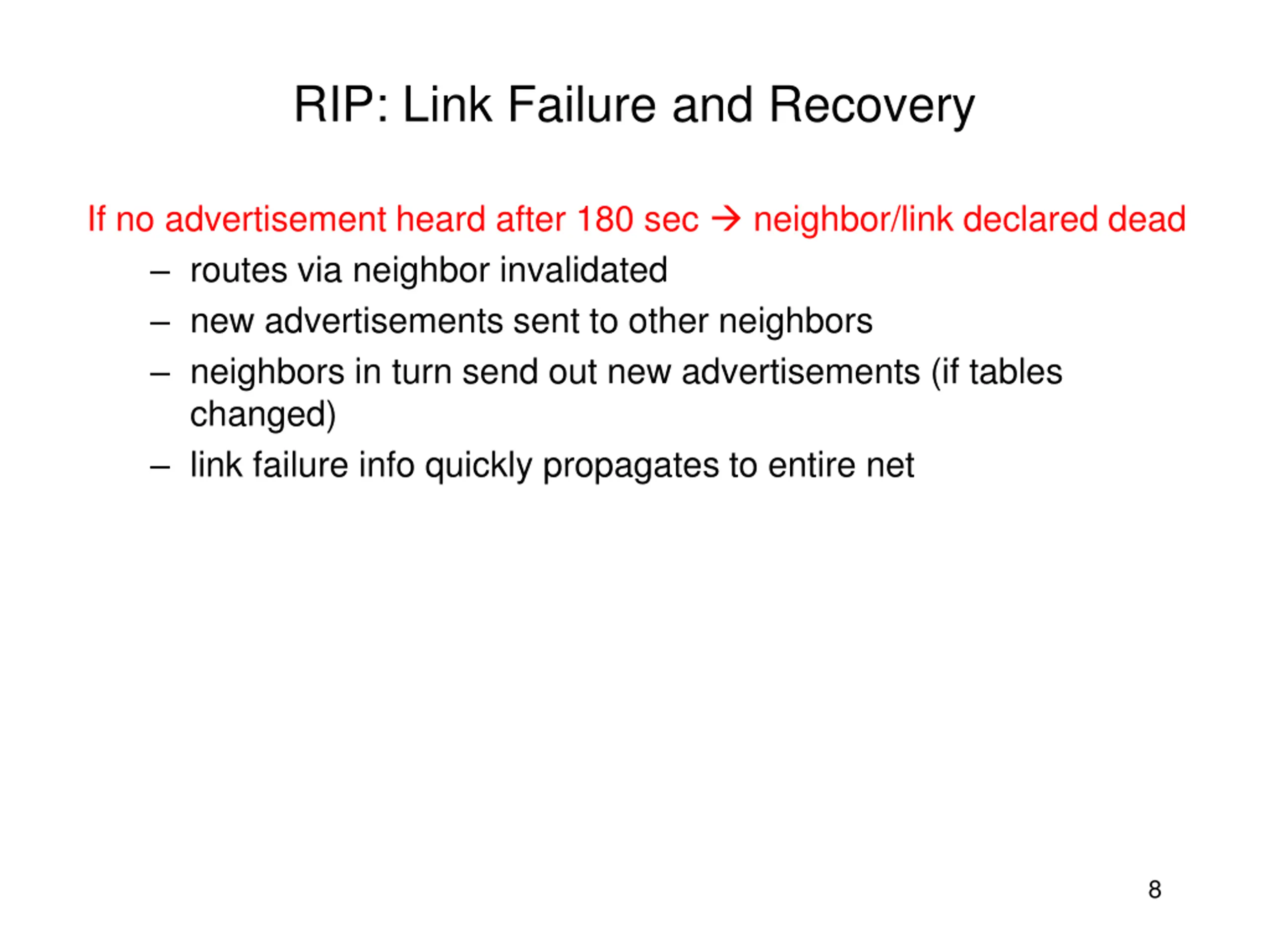 RIP: Link Failure and Recovery If no advertisement heard after 180 sec neighbor/link declared dead routes via neighbor invalidated new advertisements sent to other neighbors neighbors in turn send out new advertisements (if tables changed) link failure info quickly propagates to entire net 8