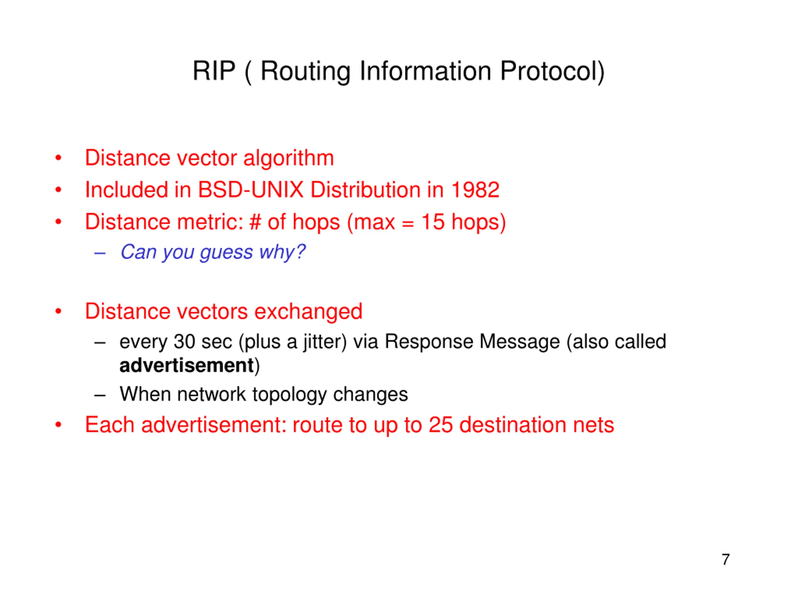 RIP ( Routing Information Protocol) Distance vector algorithm Included in BSD-UNIX Distribution in 1982 Distance metric: # of hops (max = 15 hops) Can you guess why? Distance vectors exchanged every 30 sec (plus a jitter) via Response Message (also called advertisement) When network topology changes Each advertisement: route to up to 25 destination nets 7
