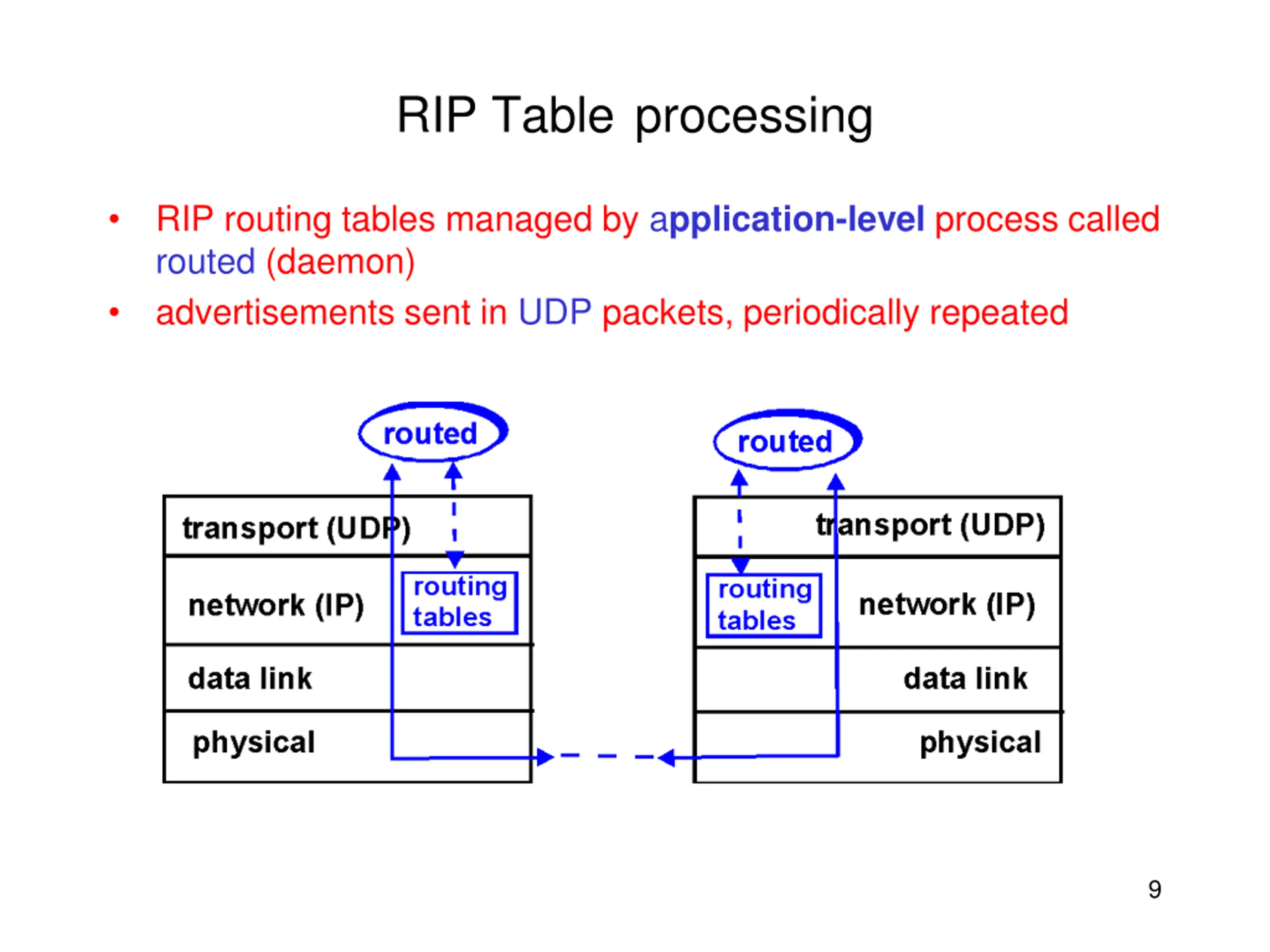 RIP Tableprocessing RIP routing tables managed by application-level process called routed (daemon) advertisements sent in UDP packets, periodically repeated 9