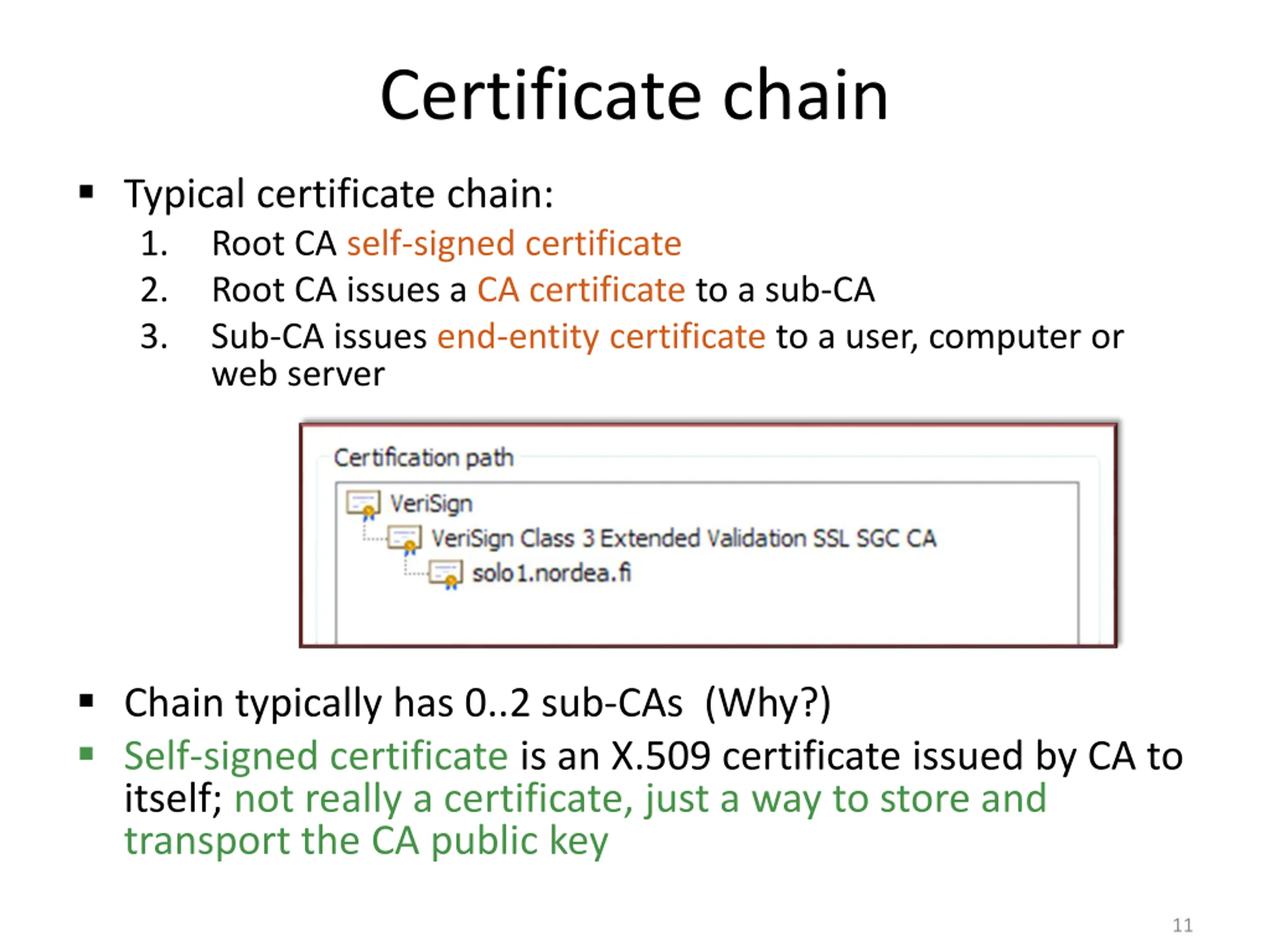 Certificate chain Typical certificate chain: 1. Root CA self-signed certificate 2. Root CA issues a CA certificate to a sub-CA 3. Sub-CA issues end-entity certificate to a user, computer or web server Chain typically has 0..2 sub-CAs (Why?) Self-signed certificate is an X.509 certificate issued by CA to itself; not really a certificate, just a way to store and transport the CA public key 11