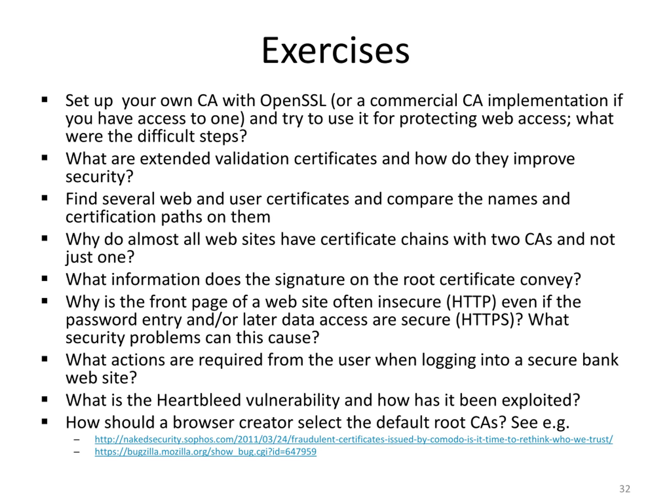 Exercises Set up your own CA with OpenSSL (or a commercial CA implementation if you have access to one) and try to use it for protecting web access; what were the difficult steps? What are extended validation certificates and how do they improve security? Find several web and user certificates and compare the names and certification paths on them Why do almost all web sites have certificate chains with two CAs and not just one? What information does the signature on the root certificate convey? Why is the front page of a web site often insecure (HTTP) even if the password entry and/or later data access are secure (HTTPS)? What security problems can this cause? What actions are required from the user when logging into a secure bank web site? What is the Heartbleed vulnerability and how has it been exploited? How should a browser creator select the default root CAs? See e.g. http://nakedsecurity.sophos.com/2011/03/24/fraudulent-certificates-issued-by-comodo-is-it-time-to-rethink-who-we-trust/ https://bugzilla.mozilla.org/show_bug.cgi?id=647959 32
