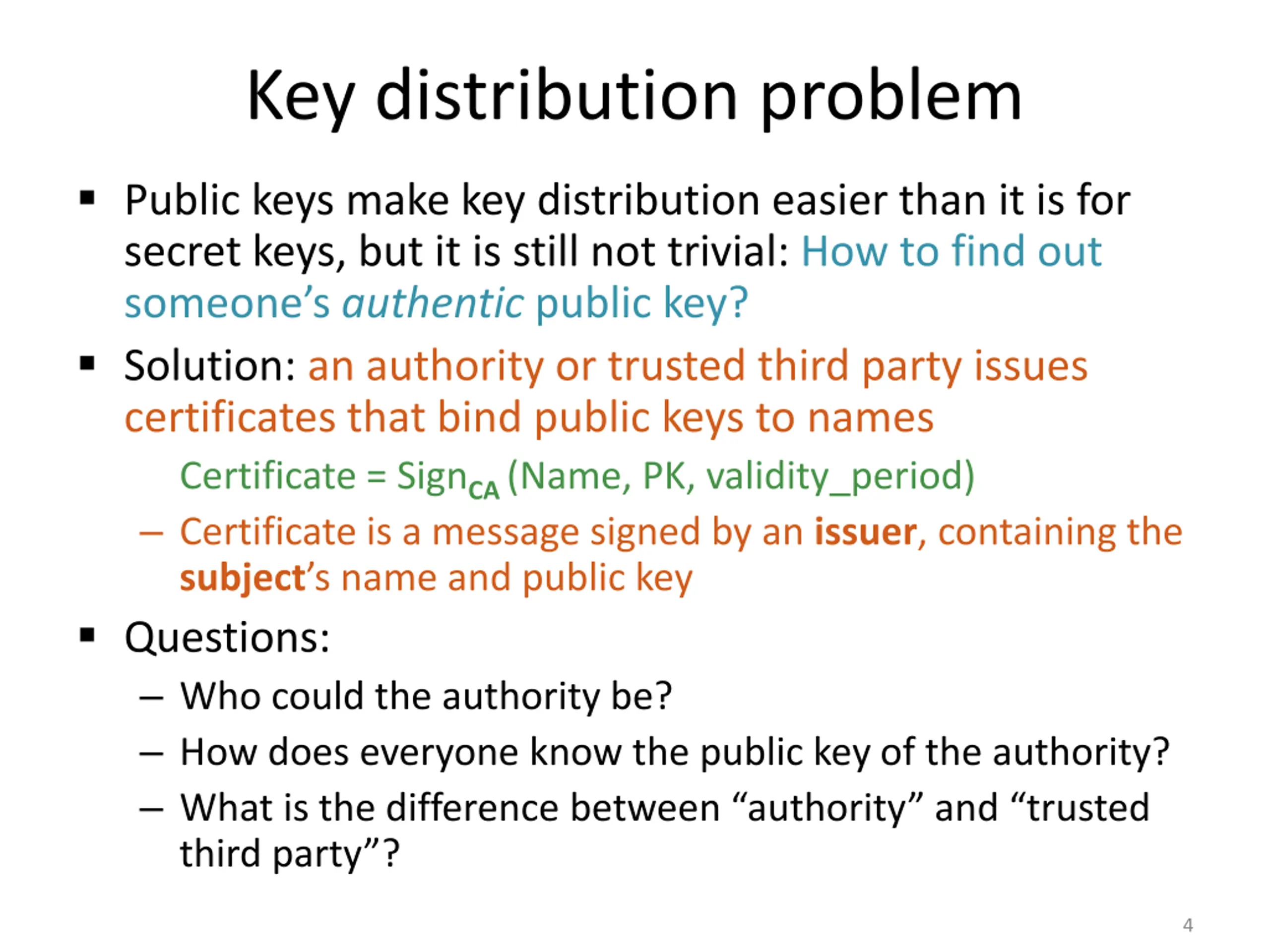 Key distribution problem Public keys make key distribution easier than it is for secret keys, but it is still not trivial: How to find out someone s authentic public key? Solution: an authority or trusted third party issues certificates that bind public keys to names Certificate = SignCA(Name, PK, validity_period) Certificate is a message signed by an issuer, containing the subject s name and public key Questions: Who could the authority be? How does everyone know the public key of the authority? What is the difference between authority and trusted third party ? 4