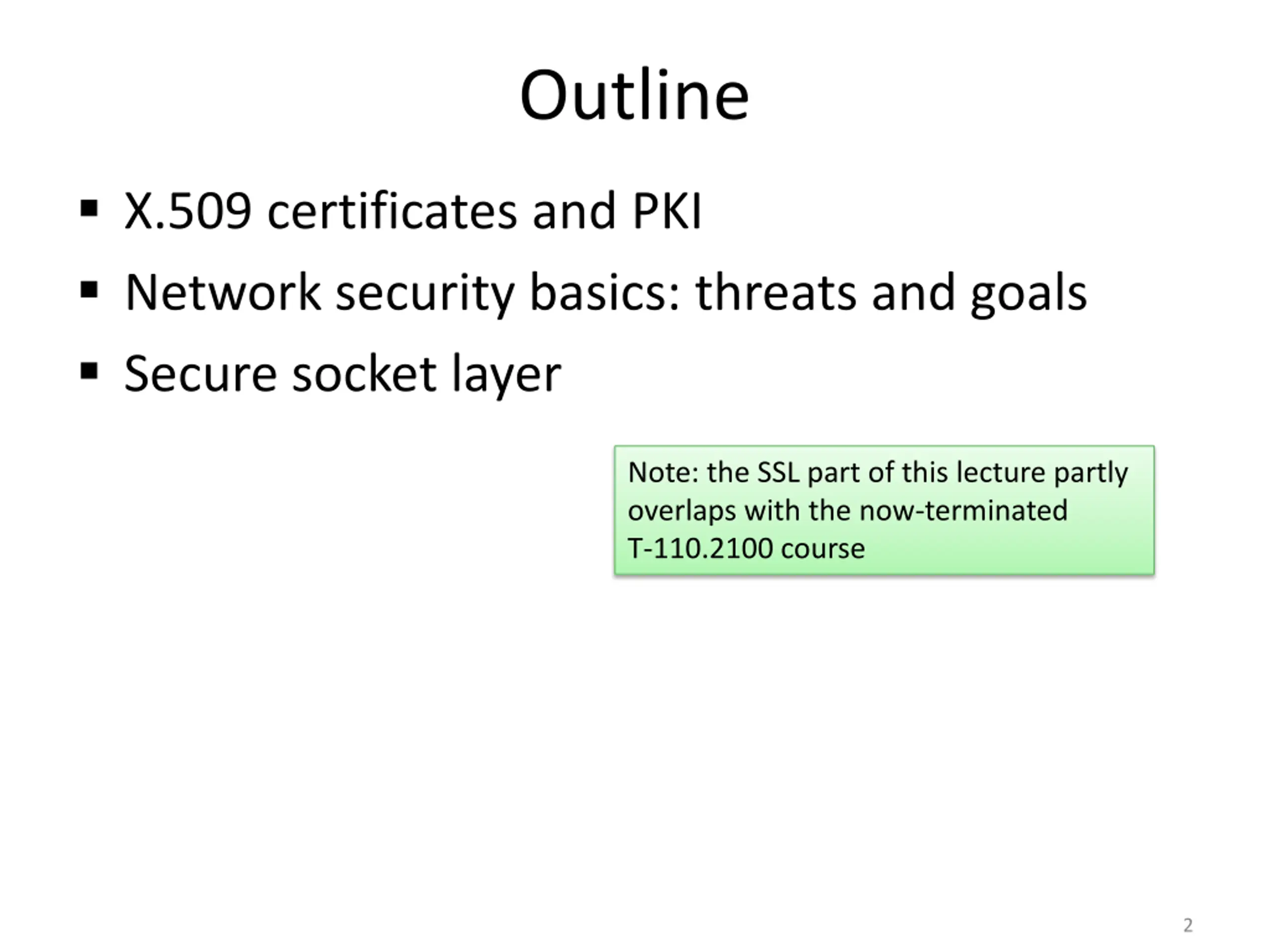 Outline X.509 certificates and PKI Network security basics: threats and goals Secure socket layer Note: the SSL part of this lecture partly overlaps with the now-terminated T-110.2100 course 2