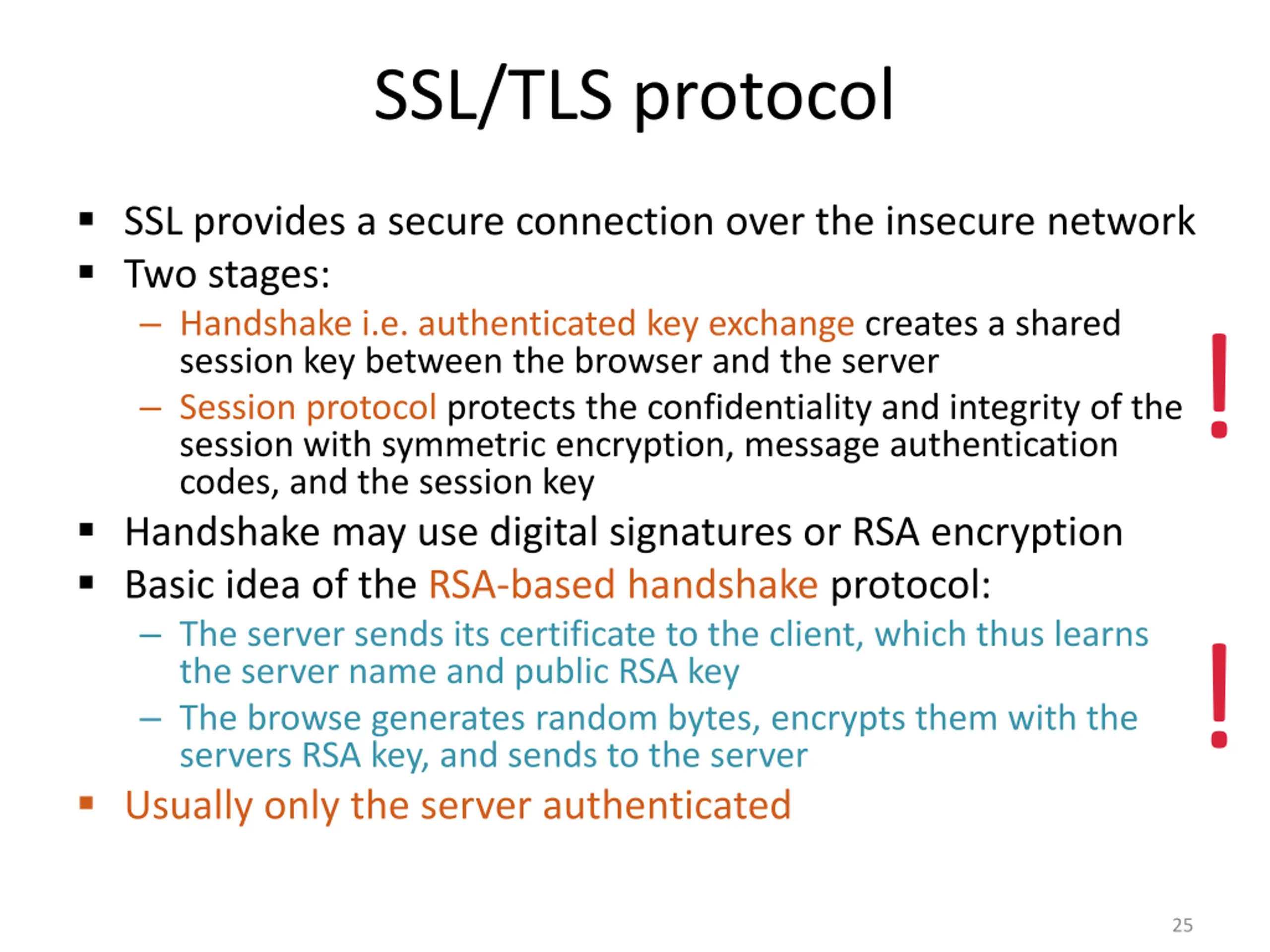 SSL/TLS protocol SSL provides a secure connection over the insecure network Two stages: Handshake i.e. authenticated key exchange creates a shared session key between the browser and the server Session protocol protects the confidentiality and integrity of the session with symmetric encryption, message authentication codes, and the session key Handshake may use digital signatures or RSA encryption Basic idea of the RSA-based handshake protocol: The server sends its certificate to the client, which thus learns the server name and public RSA key The browse generates random bytes, encrypts them with the servers RSA key, and sends to the server Usually only the server authenticated ! ! 25