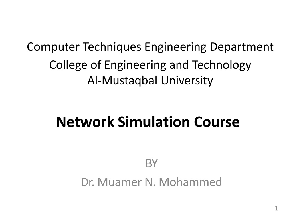 Computer Techniques Engineering Department College of Engineering and Technology Al-Mustaqbal University Network Simulation Course BY Dr. Muamer N. Mohammed 1