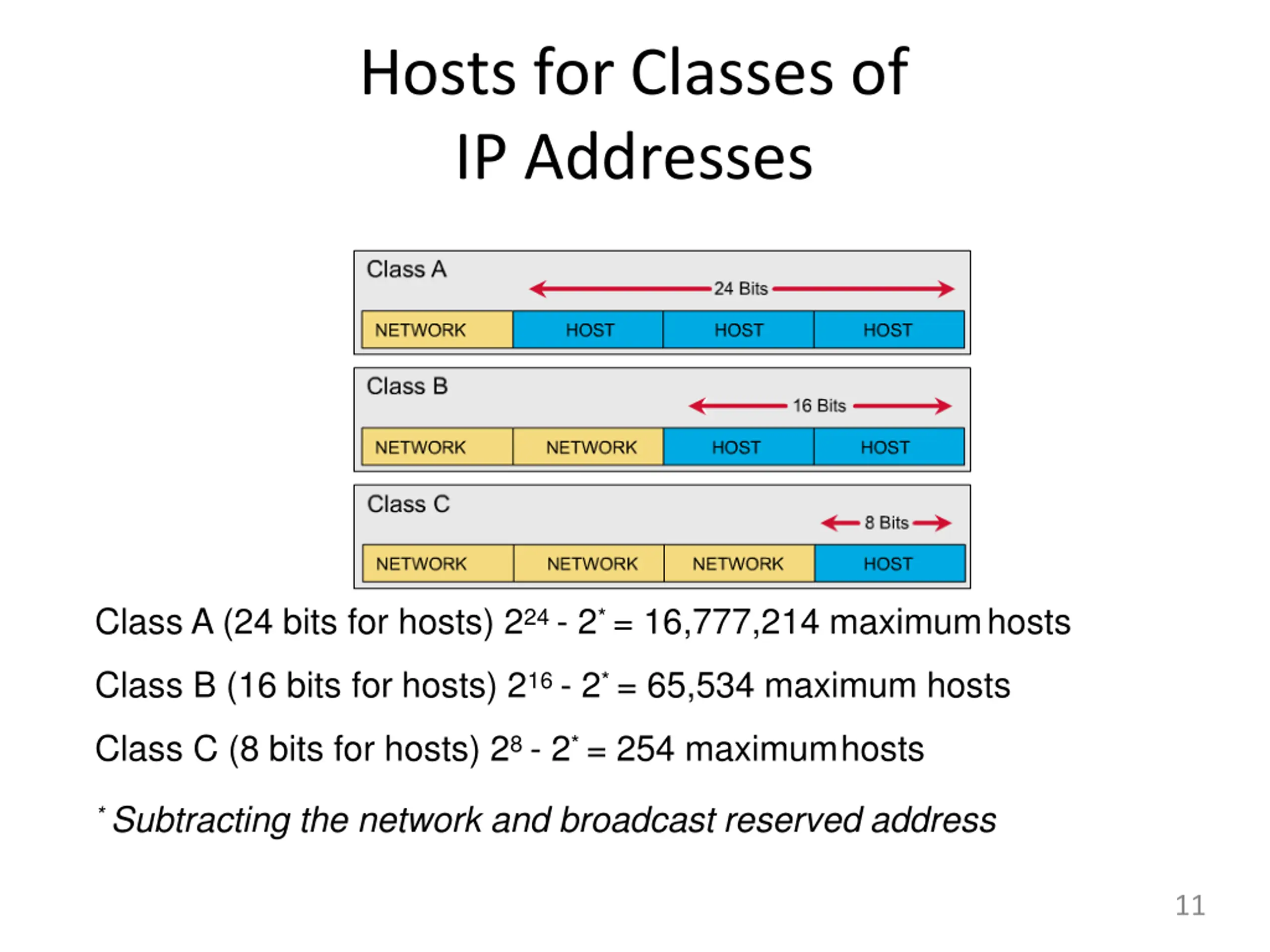 Hosts for Classes of IP Addresses Class A (24 bits for hosts) 224 - 2* = 16,777,214 maximumhosts Class B (16 bits for hosts) 216 - 2* = 65,534 maximum hosts Class C (8 bits for hosts) 28 - 2* = 254 maximumhosts * Subtracting the network and broadcast reserved address 11