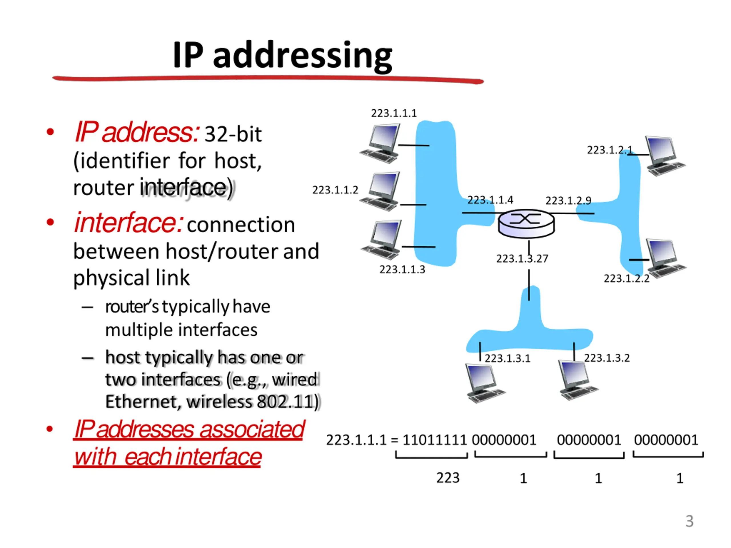 IPaddressing 223.1.1.1 IPaddress: 32-bit (identifier for host, routerinterface) interface:connection between host/routerand physical link router s typicallyhave multiple interfaces host typically has one or two interfaces (e.g., wired Ethernet, wireless802.11) IP addressesassociated with eachinterface 223.1.2.1 223.1.1.2 223.1.1.4 223.1.2.9 223.1.3.27 223.1.1.3 223.1.2.2 223.1.3.2 223.1.3.1 223.1.1.1 = 11011111 00000001 00000001 00000001 223 1 1 1 3