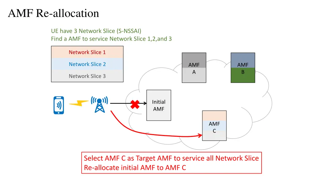 AMF Re-allocation UE have 3 Network Slice (S-NSSAI) Find a AMF to service Network Slice 1,2,and 3 Network Slice 1 Network Slice 2 AMF A AMF B Network Slice 3 Initial AMF AMF C Select AMF C as Target AMF to service all Network Slice Re-allocate initial AMF to AMF C
