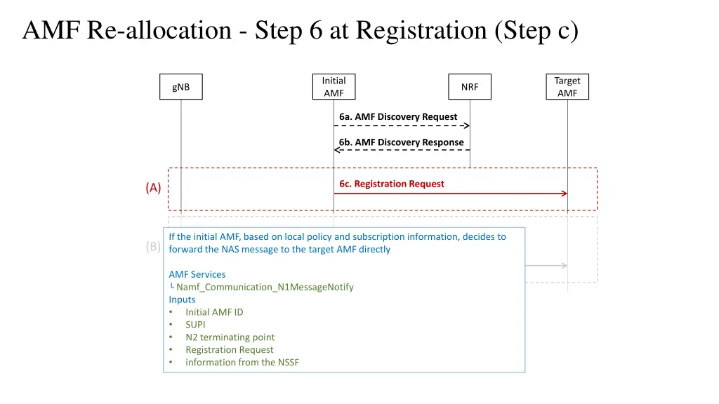 AMF Re-allocation - Step 6 at Registration (Step c) Initial AMF Target AMF gNB NRF 6a. AMF Discovery Request 6b. AMF Discovery Response 6c. Registration Request (A) 6d.Reroute NAS message If the initial AMF, based on local policy and subscription information, decides to forward the NAS message to the target AMF directly (B) 6e. Registration Request AMF Services Namf_Communication_N1MessageNotify Inputs Initial AMF ID SUPI N2 terminating point Registration Request information from the NSSF