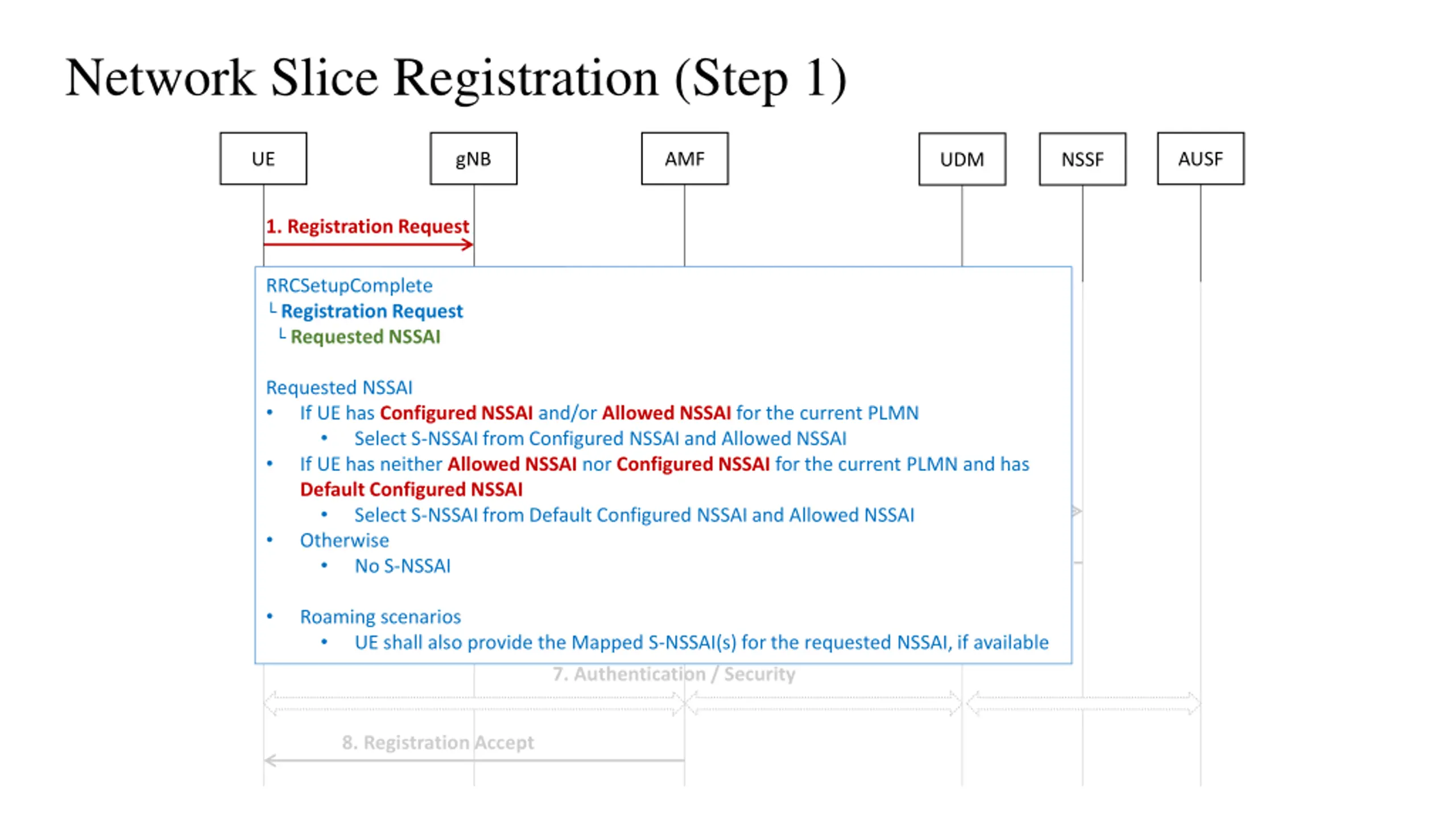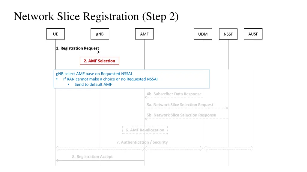 Network Slice Registration (Step 1) UE gNB AMF AUSF UDM NSSF 1. Registration Request RRCSetupComplete Registration Request Requested NSSAI 2. AMF Selection 3. Registration Request Requested NSSAI If UE has Configured NSSAI and/or Allowed NSSAI for the current PLMN Select S-NSSAI from Configured NSSAI and Allowed NSSAI If UE has neither Allowed NSSAI nor Configured NSSAI for the current PLMN and has Default Configured NSSAI Select S-NSSAI from Default Configured NSSAI and Allowed NSSAI Otherwise No S-NSSAI 4a. Subscriber Data Request 4b. Subscriber Data Response 5a. Network Slice Selection Request 5b. Network Slice Selection Response 6. AMF Re-allocation Roaming scenarios UE shall also provide the Mapped S-NSSAI(s) for the requested NSSAI, if available 7. Authentication / Security 8. Registration Accept