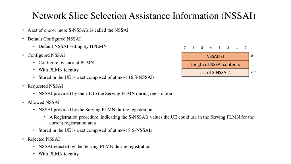 Single Network Slice Selection Assistance Information (S-NSSAI) 7 6 5 4 3 2 1 0 0 S-NSSAI IEI Identifies a Network Slice 1 Length of S-NSSAIcontents Subscribed S-NSSAIs S-NSSAI based on subscriber information, which a UE is subscribed to use in a PLMN 2 SST 3 SD 5 Mapped S-NSSAI In roaming scenarios, a mapping S-NSSAI values between HPLMN and Serving PLMN 6 Mapped configured SST 7 Mapped configured SD A Slice/Service type (SST) The expected Network Slice behavior in terms of features and services 9 A Slice Differentiator (SD) Optional information that complements the Slice/Service type(s) to differentiate amongst multiple Network Slices of the same Slice/Service type Network may at any one time serve the UE with only one Network Slice instance associated with this S-NSSAI